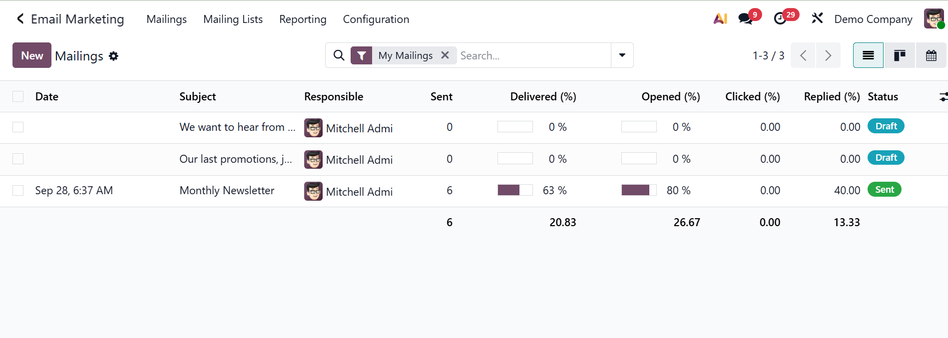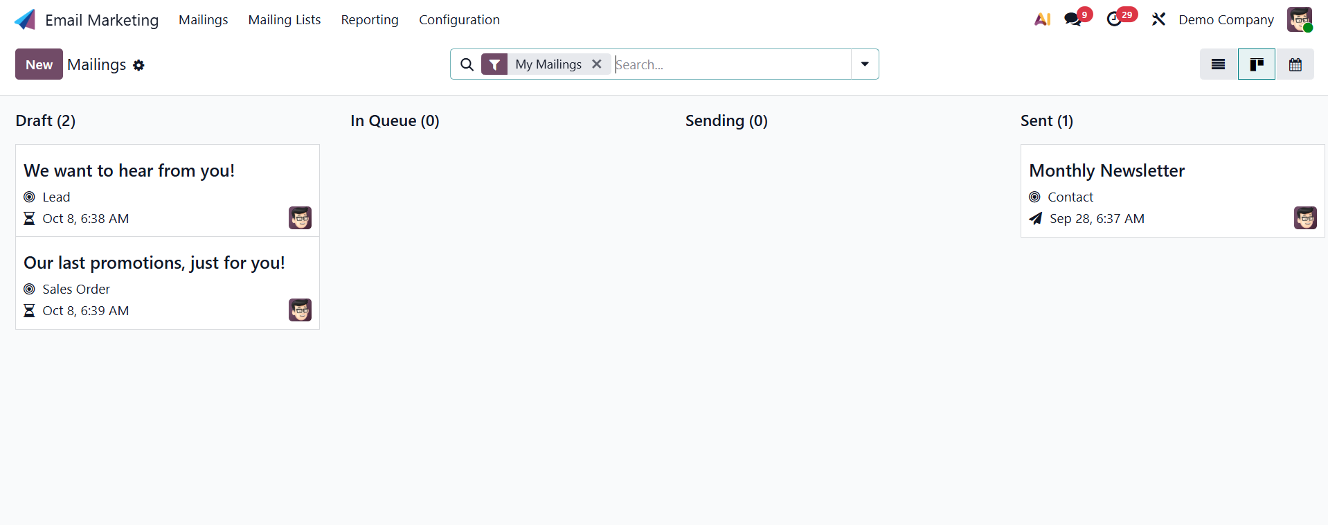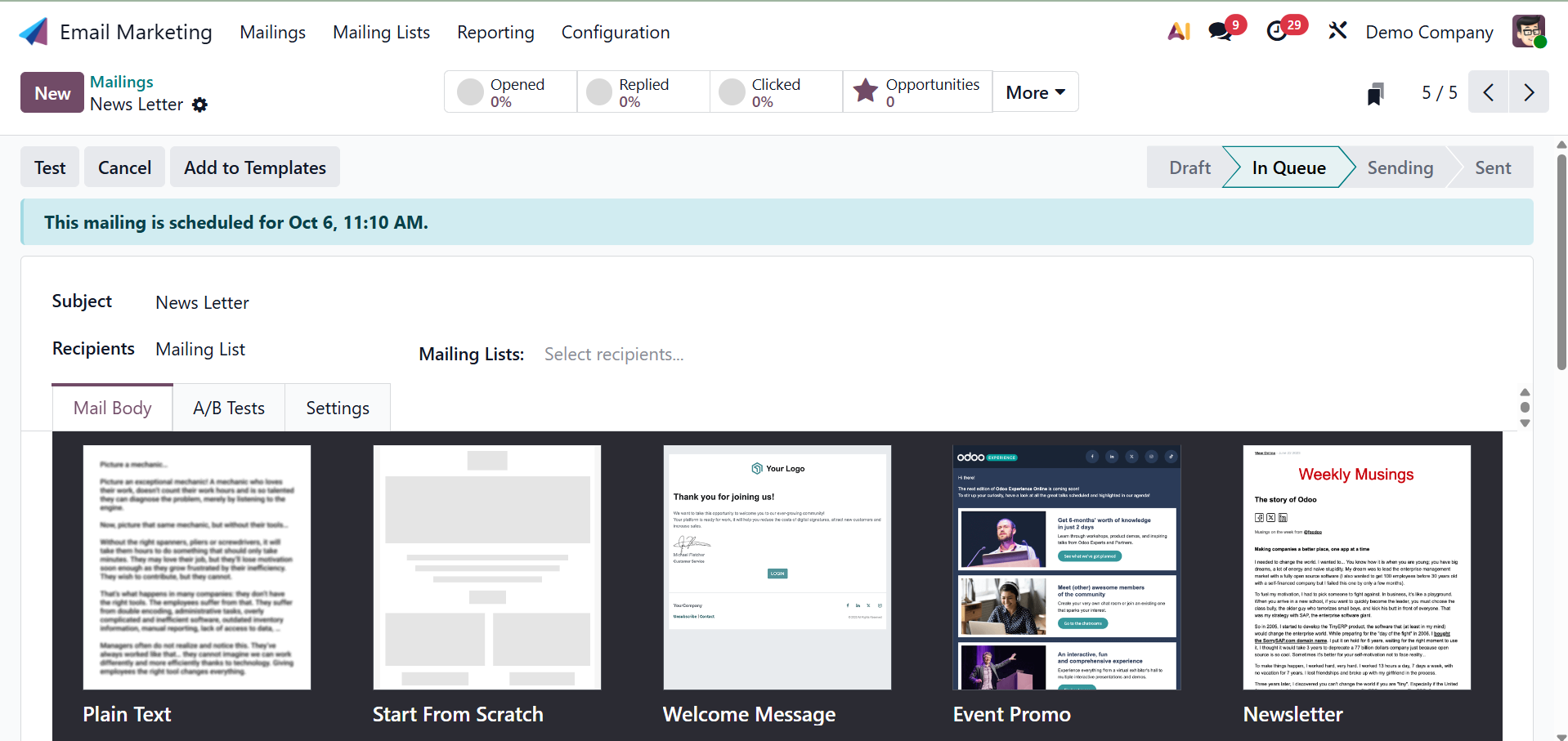 Here, you can see the details regarding the name of the mailing, recipient type, and the scheduled date.