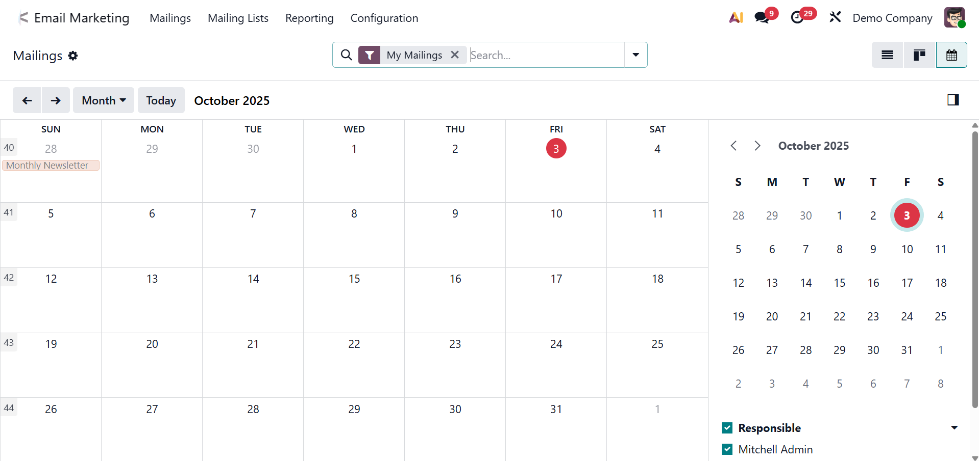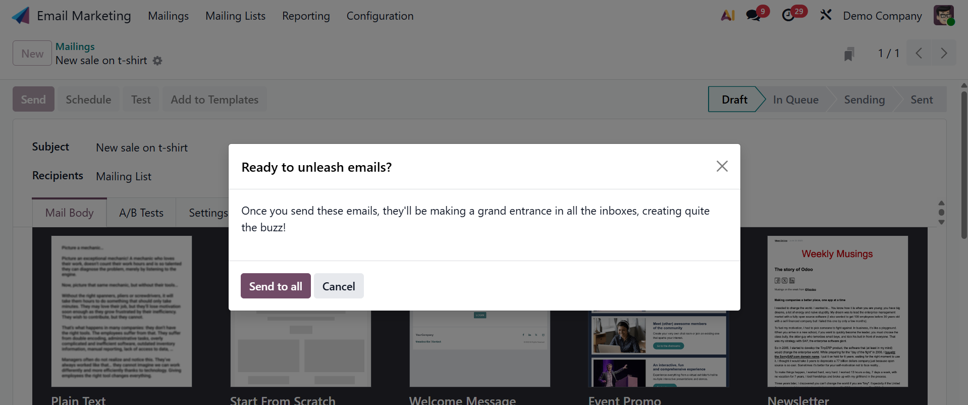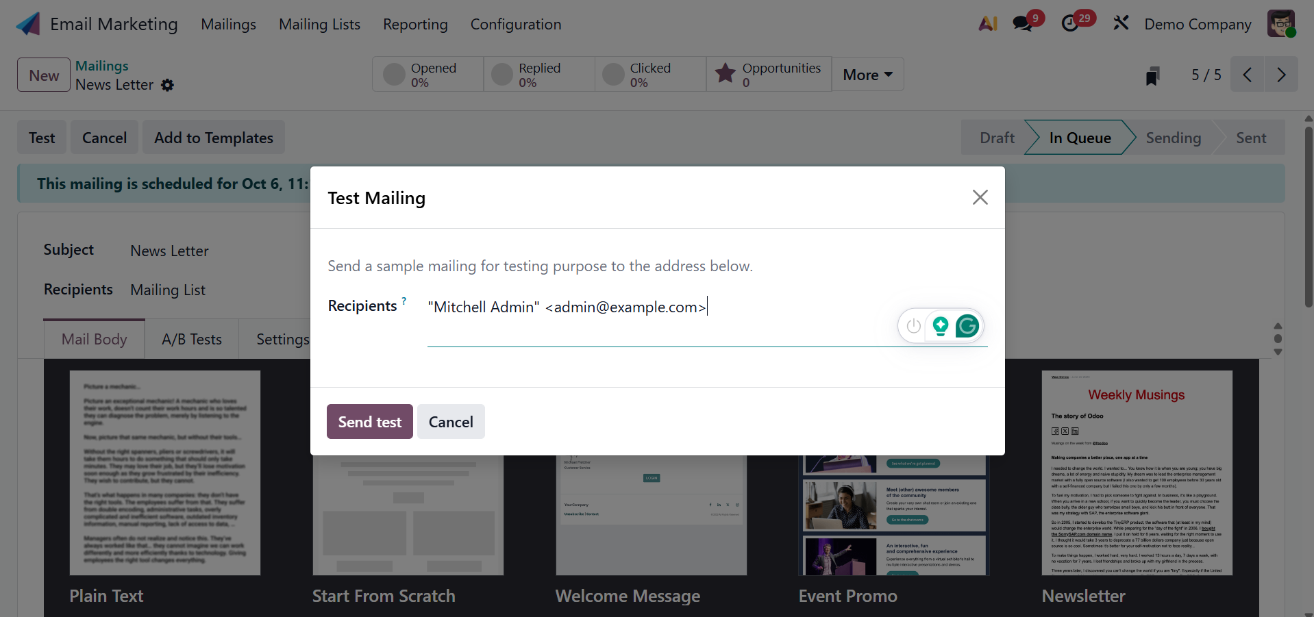 Here, you can see the details regarding the name of the mailing, recipient type, and the scheduled date.