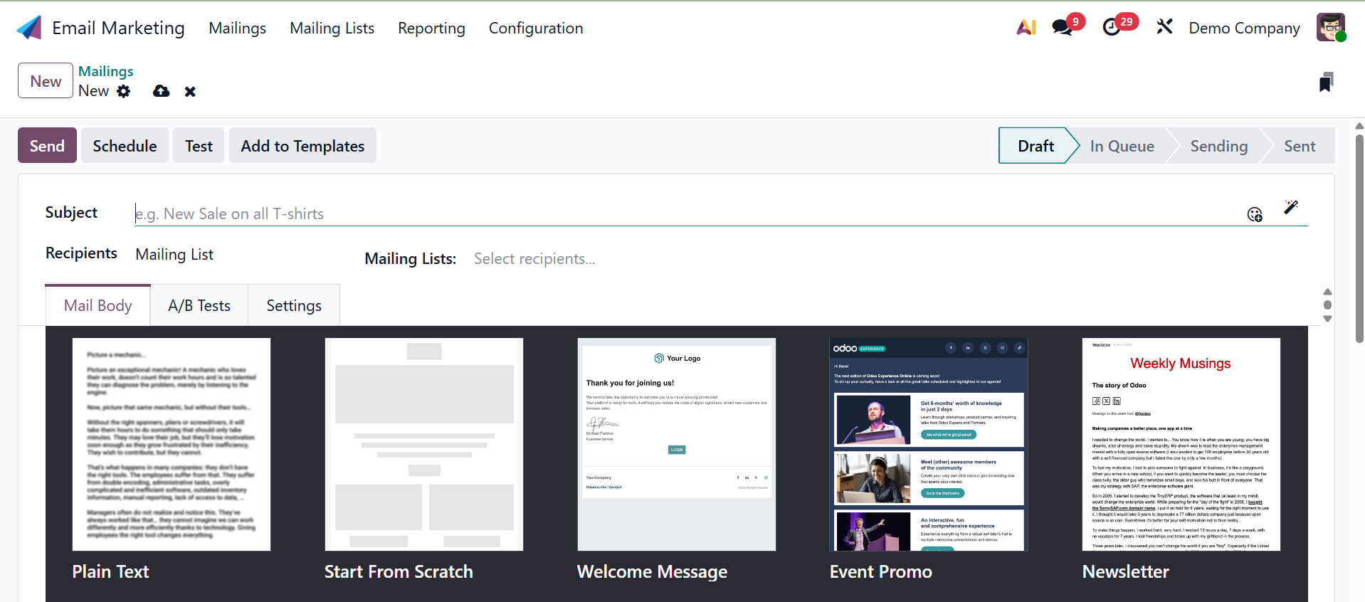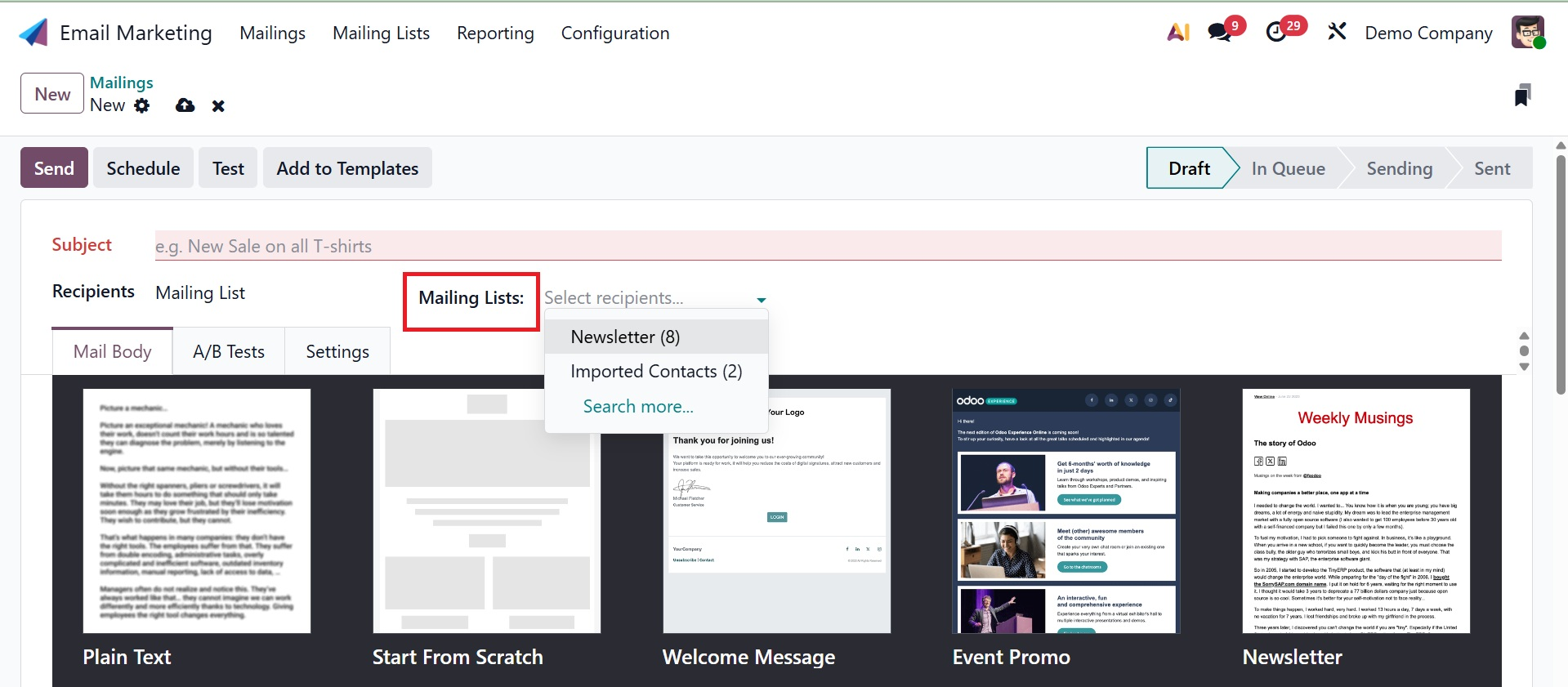 In the provided field, you can now choose the mailing list, as shown below. The drop-down menu for the mailing list has options that must be selected. The main menu also gives you access to a customisable mailing list.