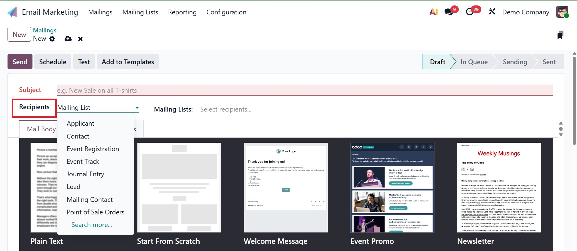 The subject of the email can be written in the space provided on the creation page. If necessary, emojis can also be used in the discussion. You may choose the Recipients option from the drop-down box that appears just below it by clicking on it.