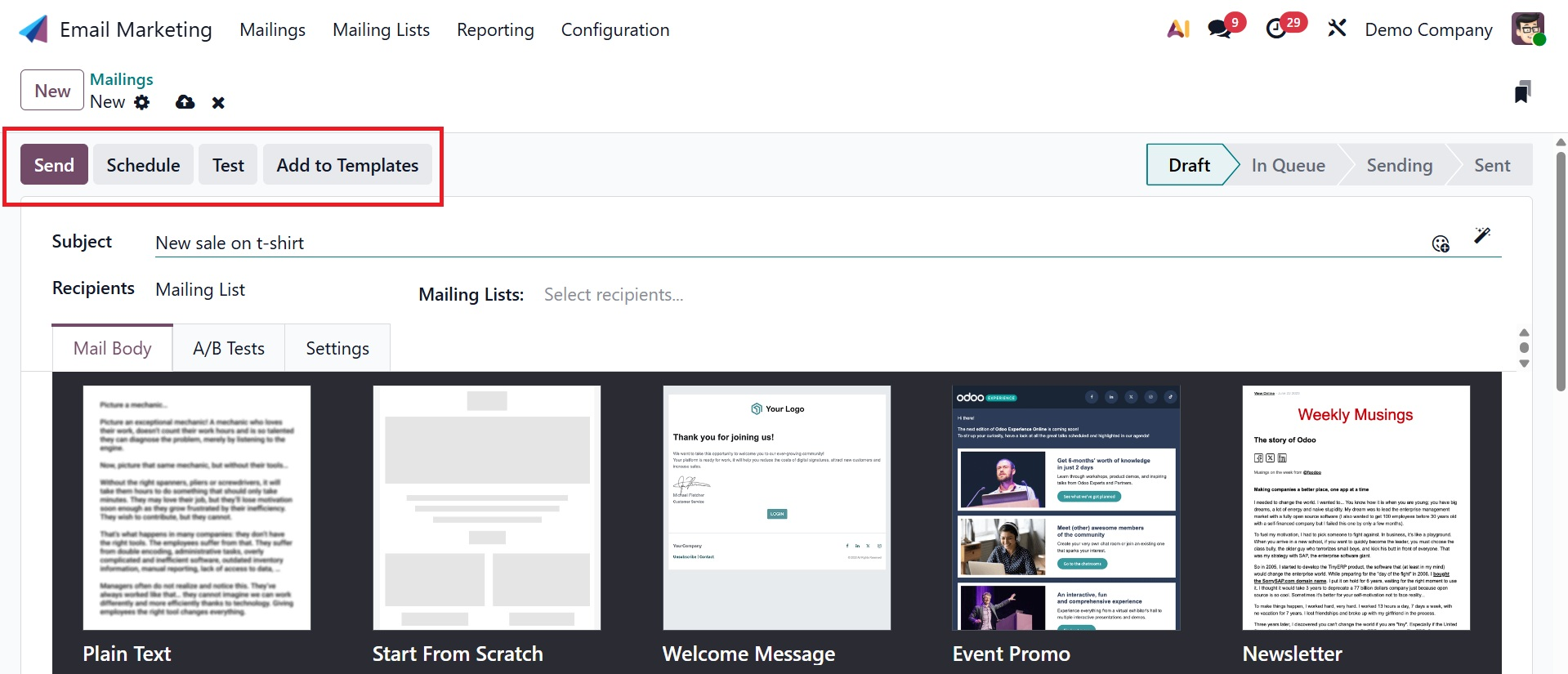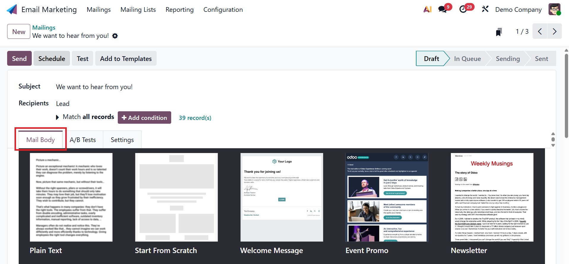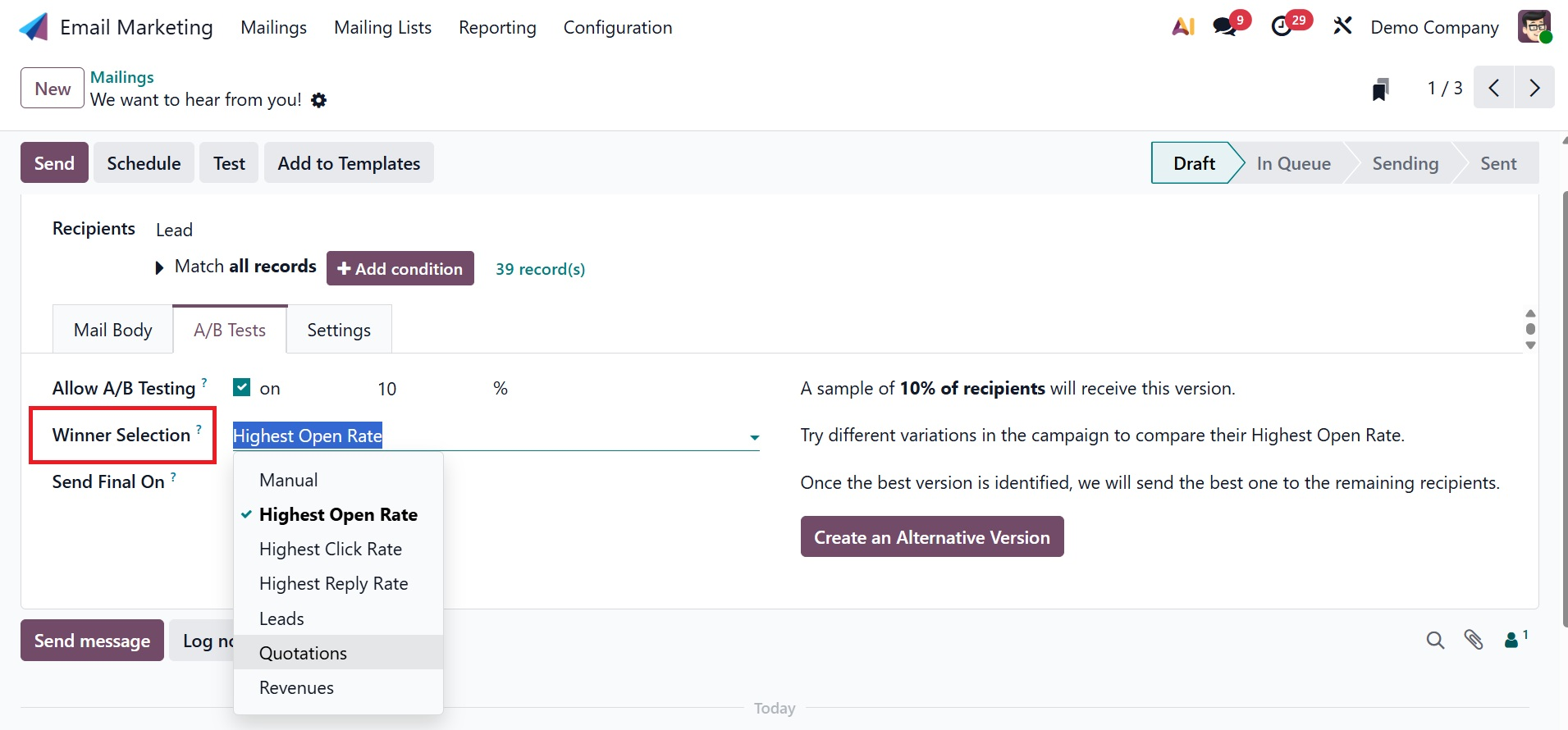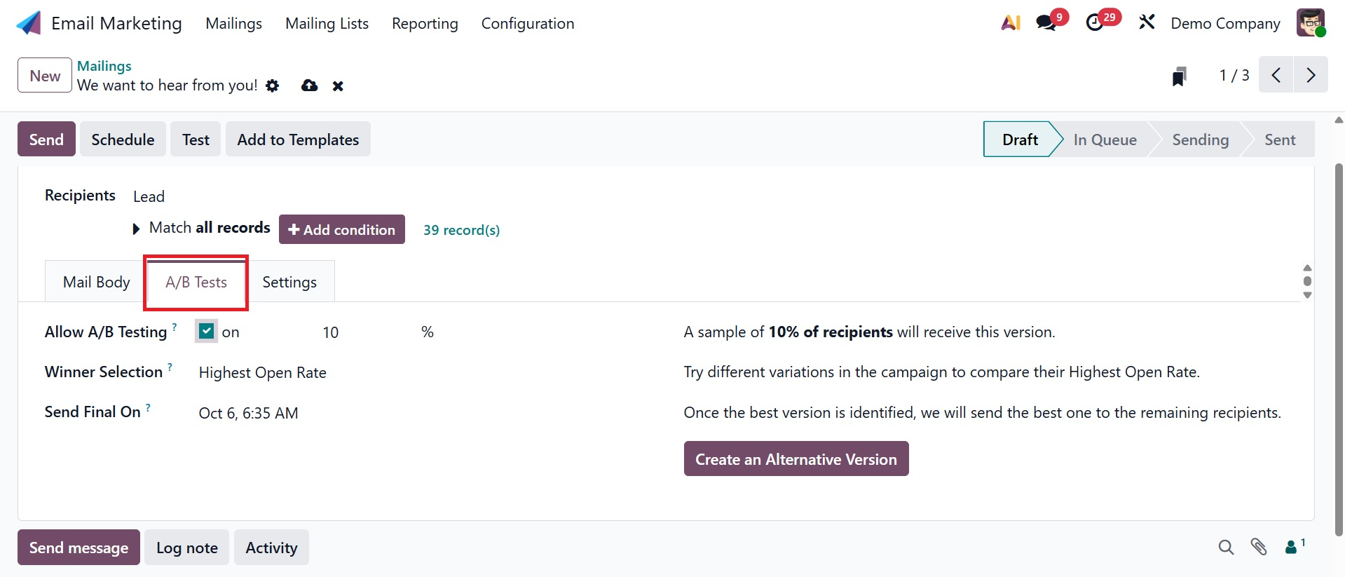 Then you have the  Send Final On field, where users can choose the date that instructs Odoo when to choose which email is the "winning" one and distribute that version of the message to the other recipients. To the right of those fields is a "Create an Alternative Version" button. Clicking it allows the user to write a fresh email draft for testing in Odoo's Mail Body tab.
