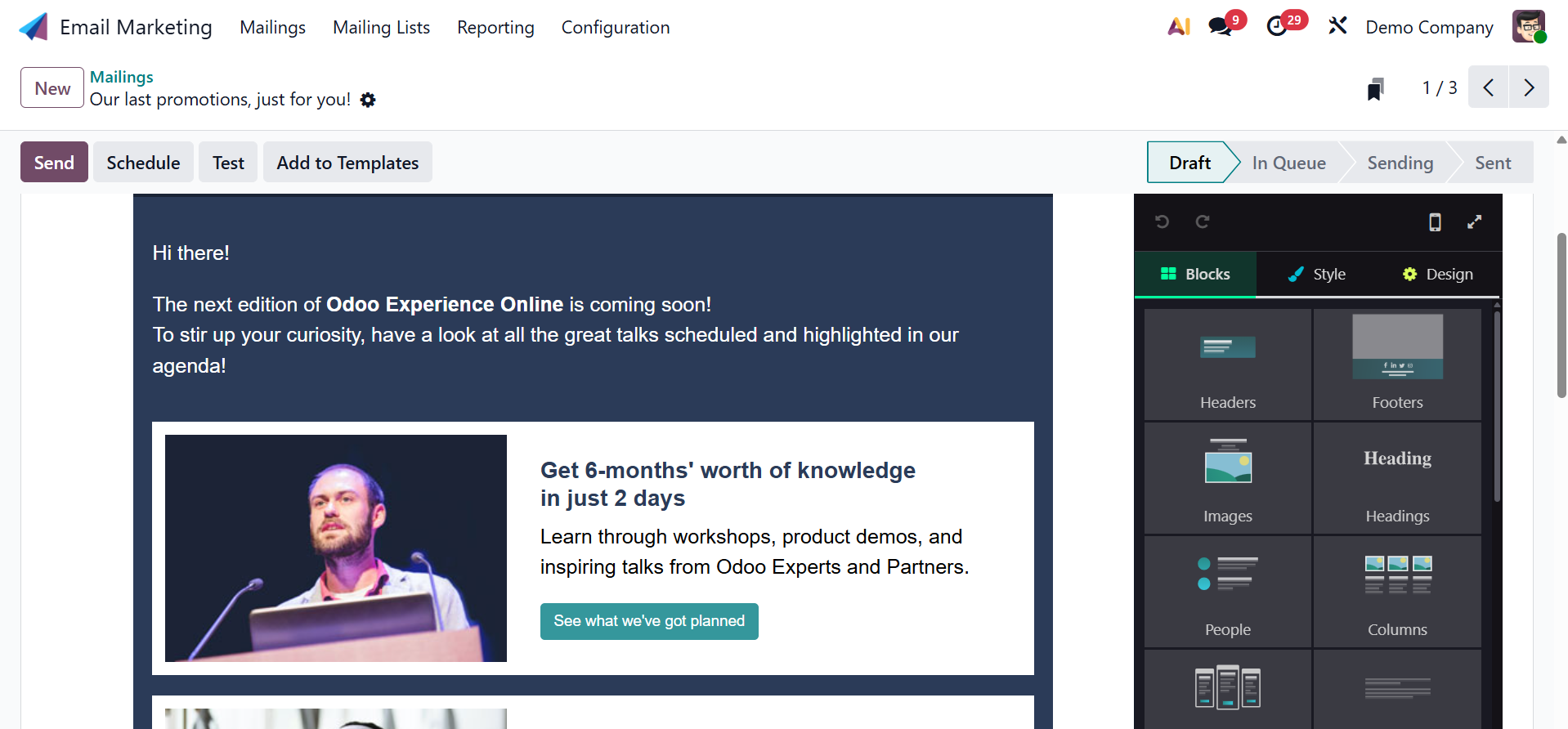 Additionally, clicking the preview will open our new snippet. Next, we can use the snippet tools to change the theme. We may create new email snippets for Odoo 19 email marketing in this way. You can utilize the blocks there, alter them, and create designs based on our model.