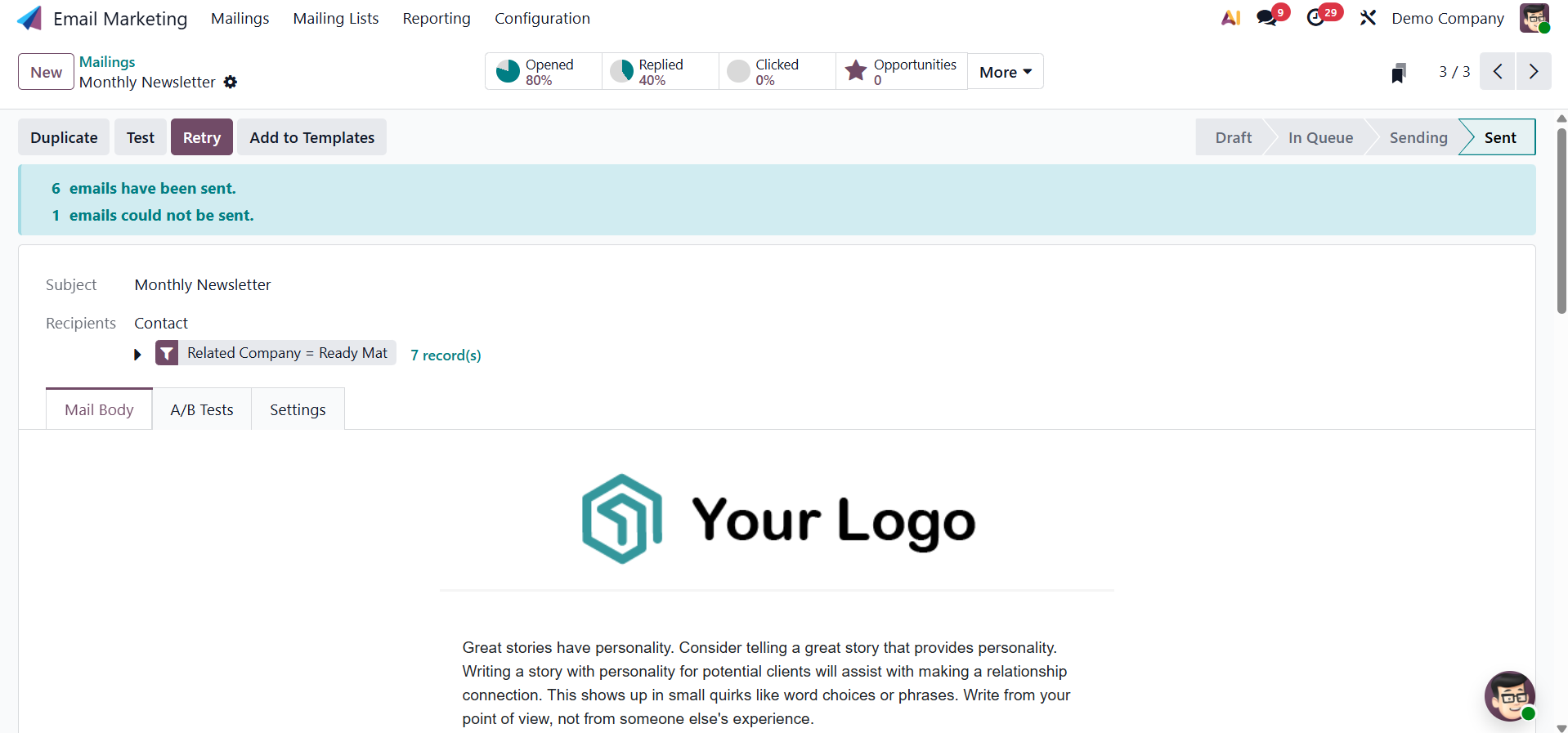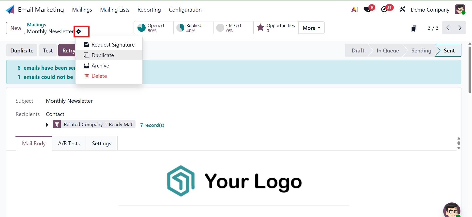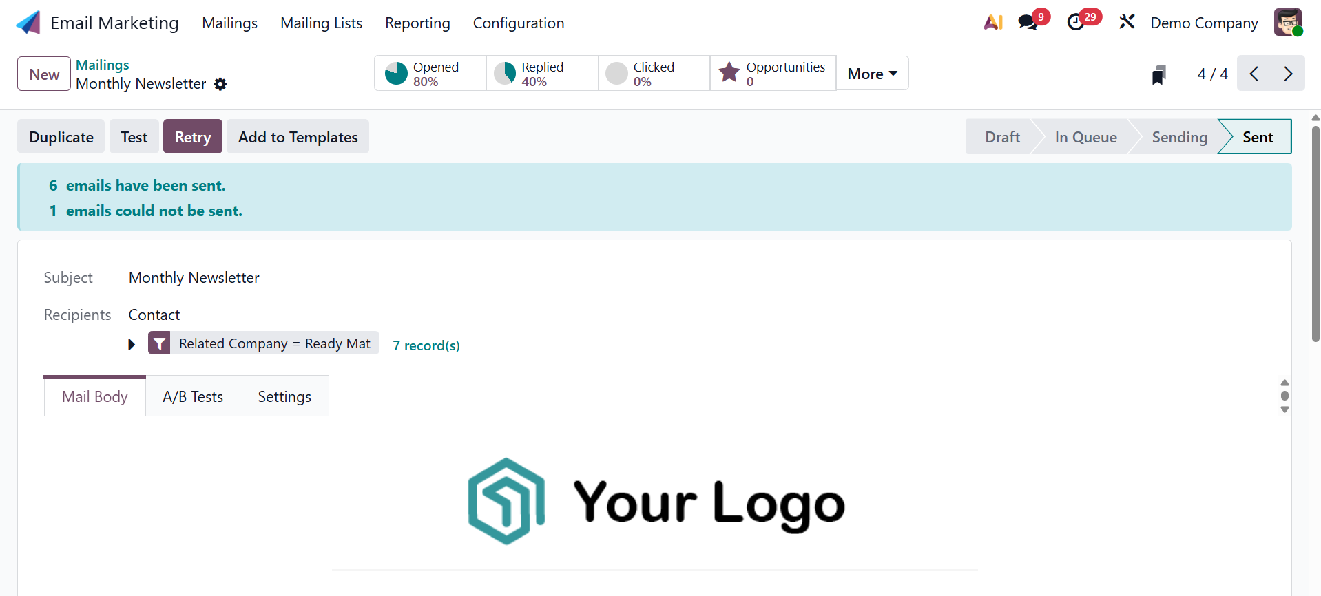 Once you have completed all of those steps, you will see a variety of smart buttons, such as Leads, Opportunities, Quotations, Invoiced, Received, Opened, Clicked, Replied, Bounced, Sent, and Ignored, as seen in the screenshot below.
