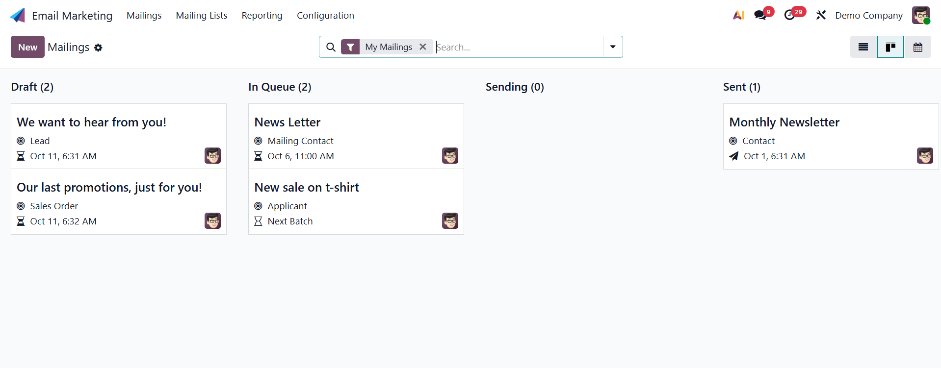 You can obtain all the information you require about the leads this email has produced by clicking on the Lead button, which provides a link that will direct you to the lead site. Then, beneath these smart buttons, you will see quotes, invoices, and the proportion of people who received, opened, clicked, replied, bounced, sent, and ignored. The Kanban view clearly displays the status view that we developed. This is because those stages are the foundation of the kanban worldview. The screenshot below then displays the Kanban view.