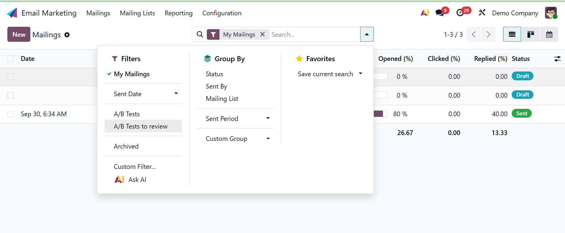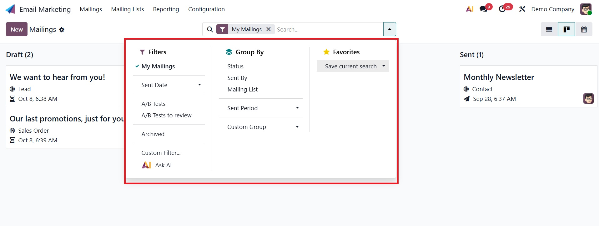 You may now choose from a variety of criteria under the criteria option, including My Mailings, Send date, A/B test, A/B tests to review, Archived, Custom Filter, and ask AI.. You can also choose Status, Send By, Mailing list, Sent period, and Custom group options under the Group By option. The specific message can also be added to Favorites, which provides the option of  Save a Current Search.