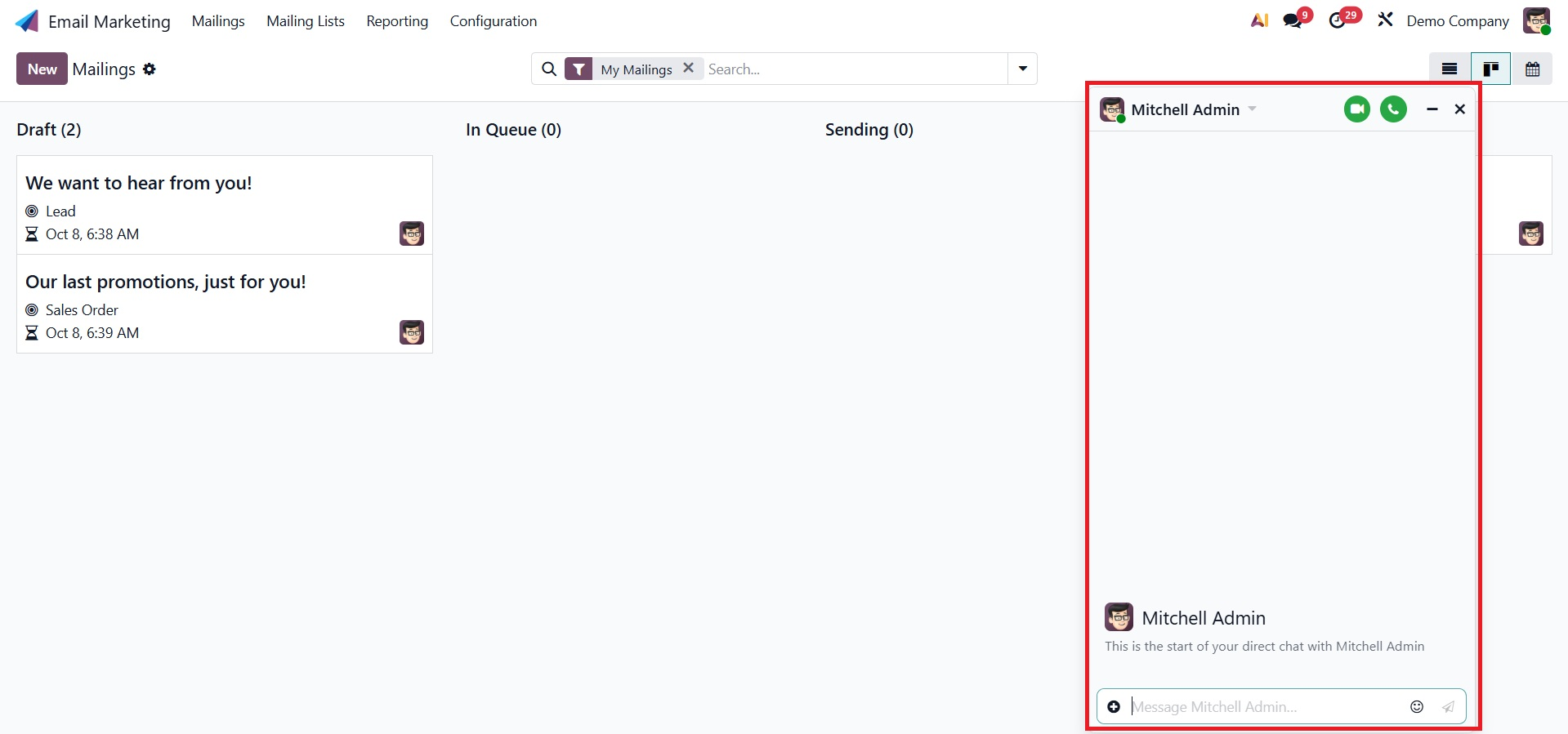 - Lead: In the CRM module, send emails to contacts that were generated from sales leads.