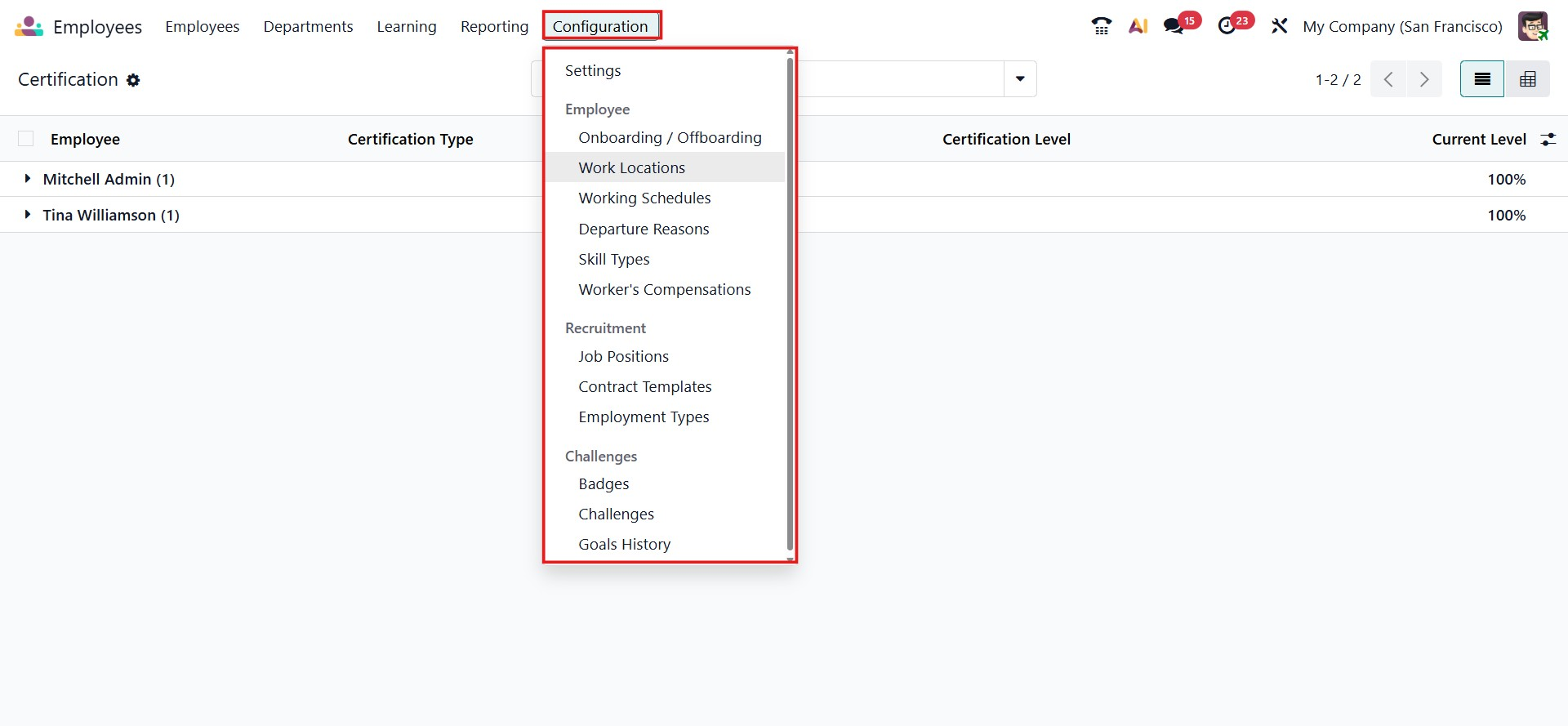 The Gamification system includes the Badges option in the Employee Module Configuration of Odoo. It enables companies to design, oversee, and award badges to staff members according to their performance, accomplishments, and training development.