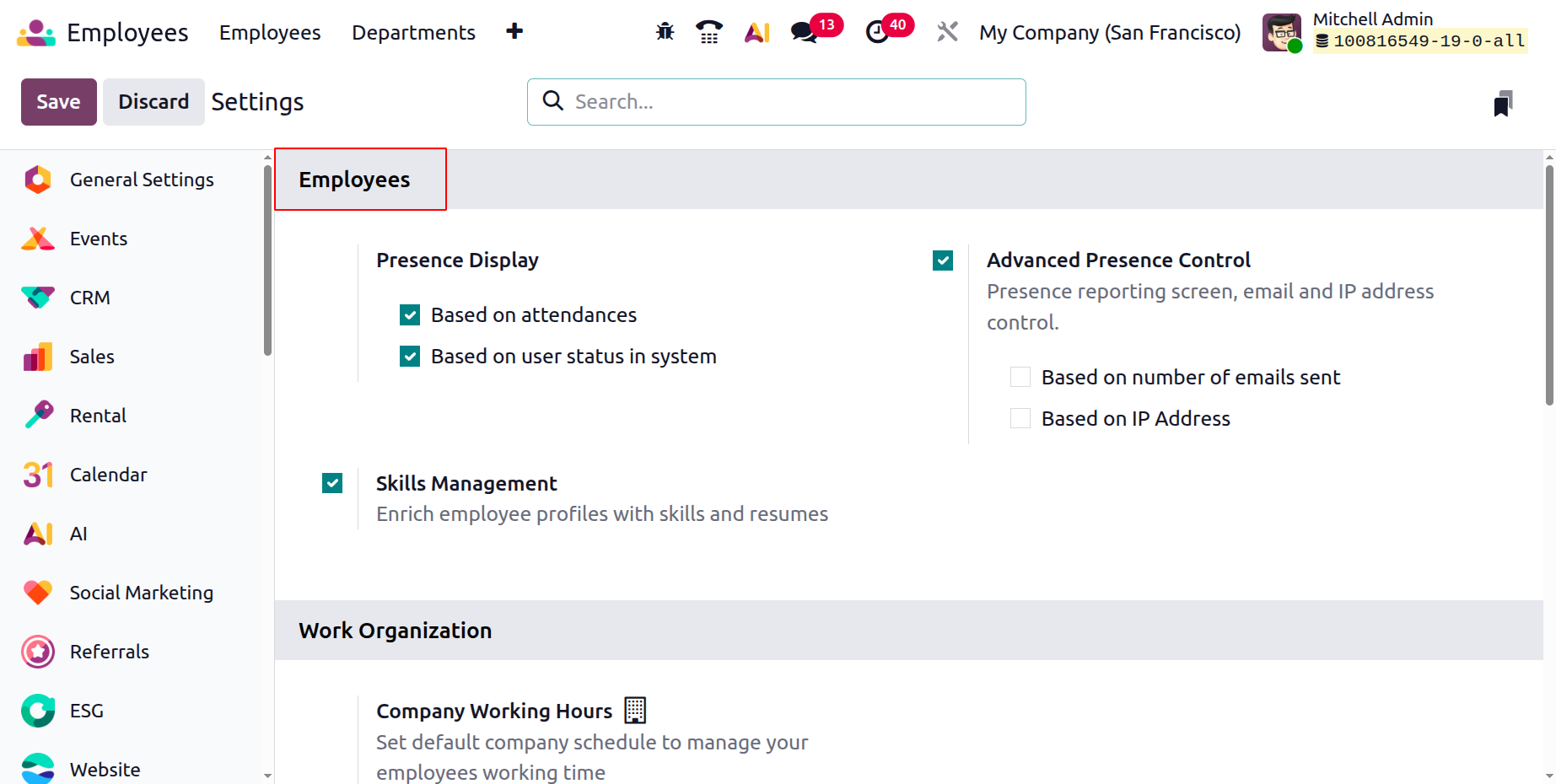 Under the Employees section, Odoo 19 provides options to control how employee presence is displayed in the system. The Presence Display can be configured based on attendance records or the user’s status in the system, enabling accurate visibility of employee availability. Advanced Presence Control can also be enabled to manage presence reporting using additional parameters such as email activity or IP address control. Additionally, the Skills Management option allows organizations to enrich employee profiles by enabling skills and resume tracking.