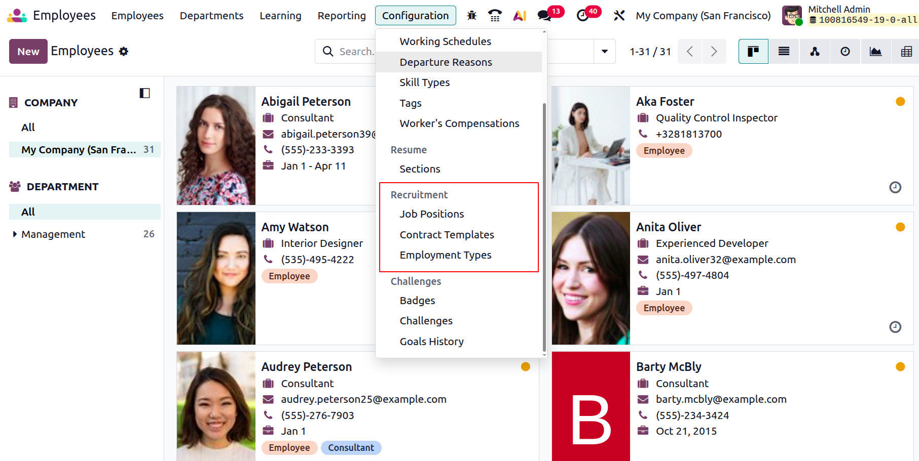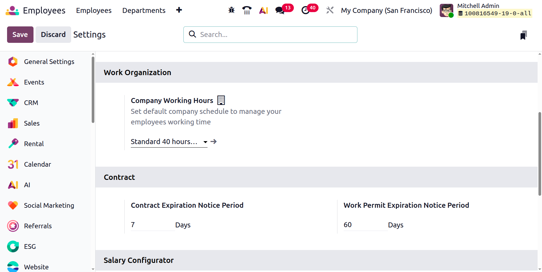 The Configuration menu of the Odoo 19 Employees module allows administrators to define core settings related to employee management, work organization, contracts, and salary configuration. These settings help standardize employee data and automate HR processes across the organization.