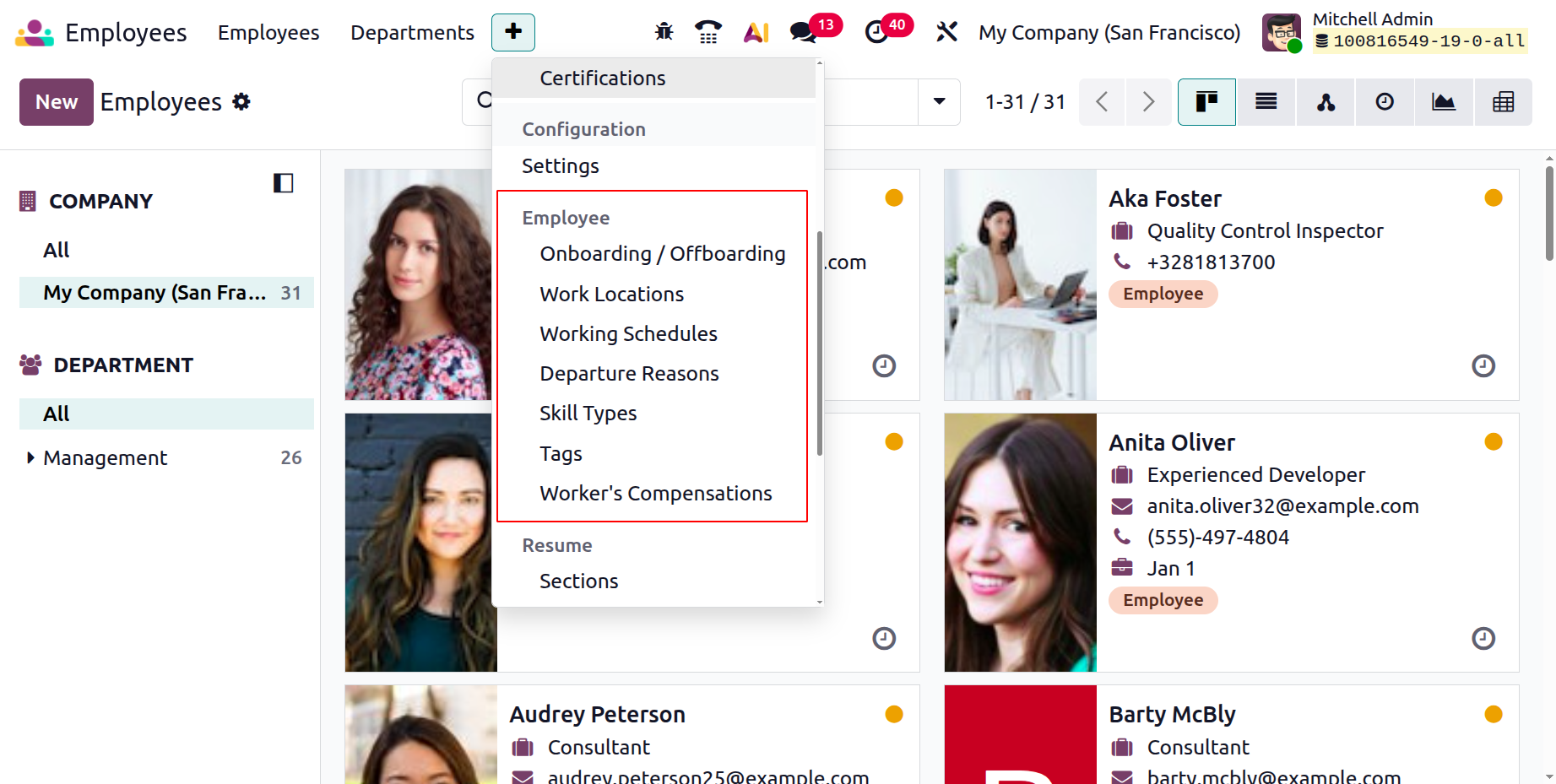 The Employees configuration area in Odoo 19 is dedicated to defining the structural and operational elements required for effective employee management. These settings help organizations standardize employee records, automate HR workflows, and maintain consistency across departments.