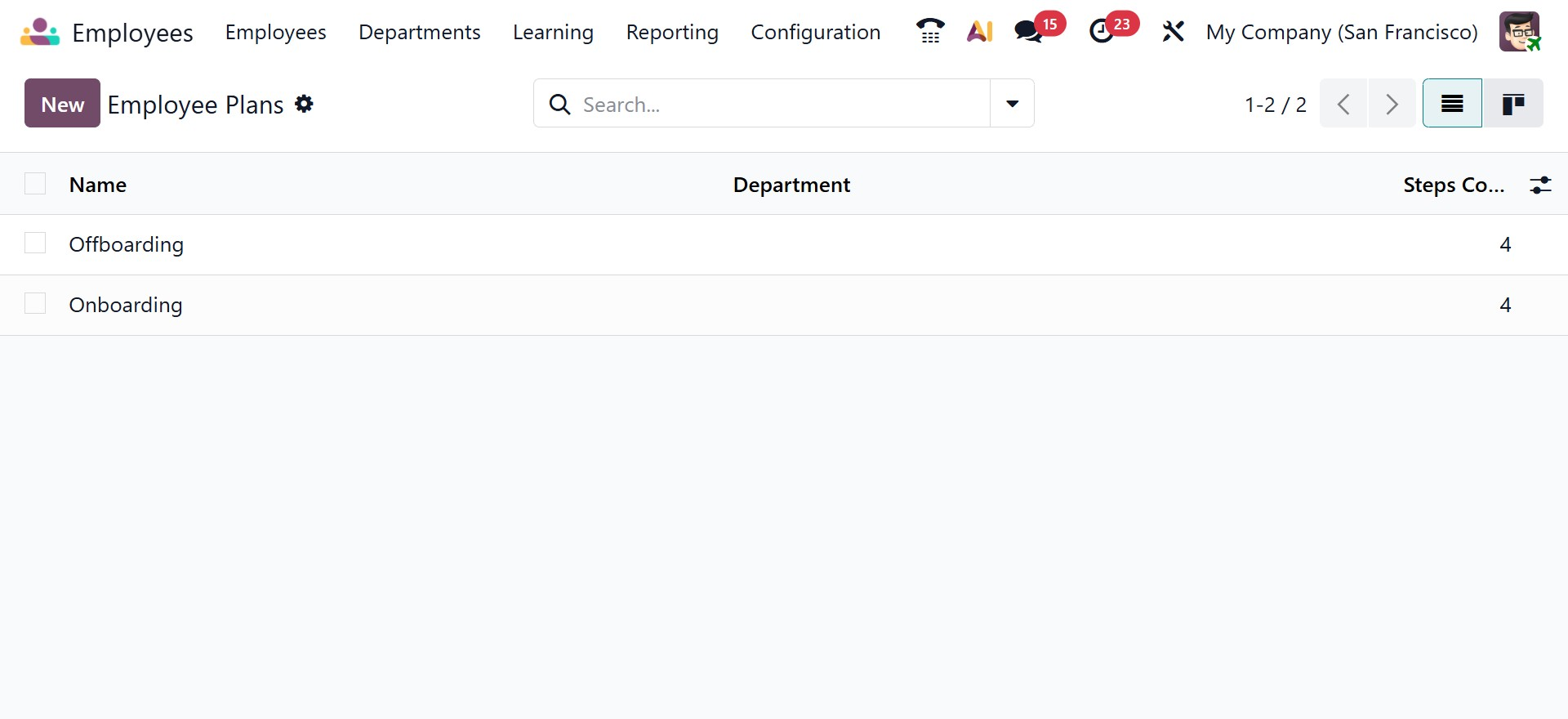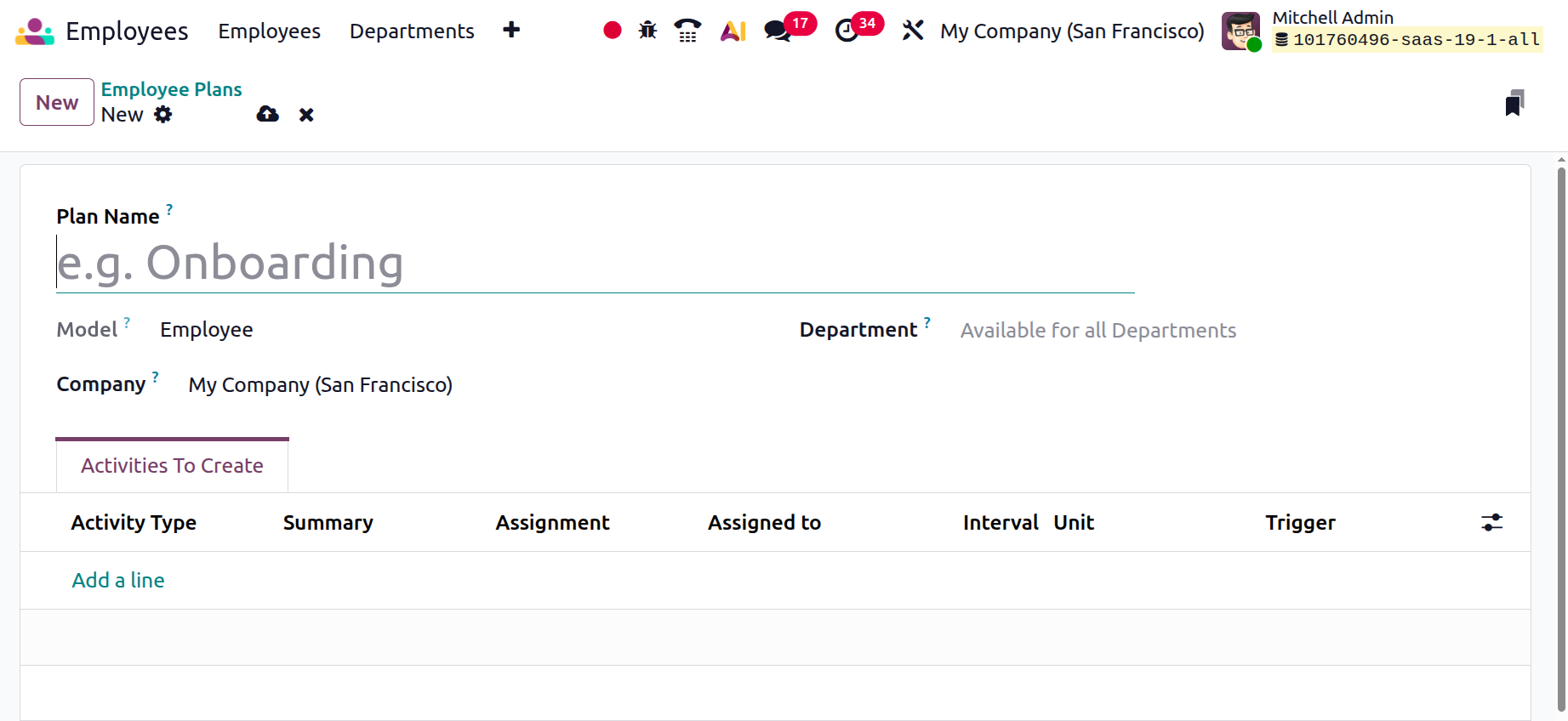 When you click the New button to create a new onboarding or offboarding plan, a configuration window opens where you can enter all these details. This window allows you to fully define the structure of the plan, including company visibility, department applicability, and the sequence of activities. Once saved, the plan can be linked to an employee record, and Odoo will automatically generate the configured activities based on the defined triggers. This automation ensures that managers, HR teams, and employees receive timely reminders and clearly assigned responsibilities, making the onboarding and offboarding processes organized, efficient, and error-free.