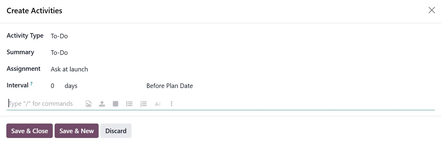Each plan is configured under Employees → Configuration → Employee Plans. When creating or editing a plan, you can define the Plan Name, select the related Model (such as Employee), and specify whether it applies to a particular company or department. Inside the plan, the Activities to Create tab allows you to add multiple predefined activities using the Add a Line option. When you click Add a Line, a dedicated activity creation form appears where you can configure the details of the activity. In this form, you can select the Activity Type (such as To-Do, Call, or Meeting), enter a clear Summary, and define the Assignment, which determines who will be responsible for the task (for example, ask at launch or assign to a specific user). You can also configure the Interval in days and specify whether the activity should be scheduled before or after the Plan Date, ensuring accurate trigger timing. After entering the required details, you can use Save & Close to return to the plan or Save & New to immediately create another activity. This structured setup ensures that all necessary tasks are automatically generated at the right time whenever the employee plan is applied.