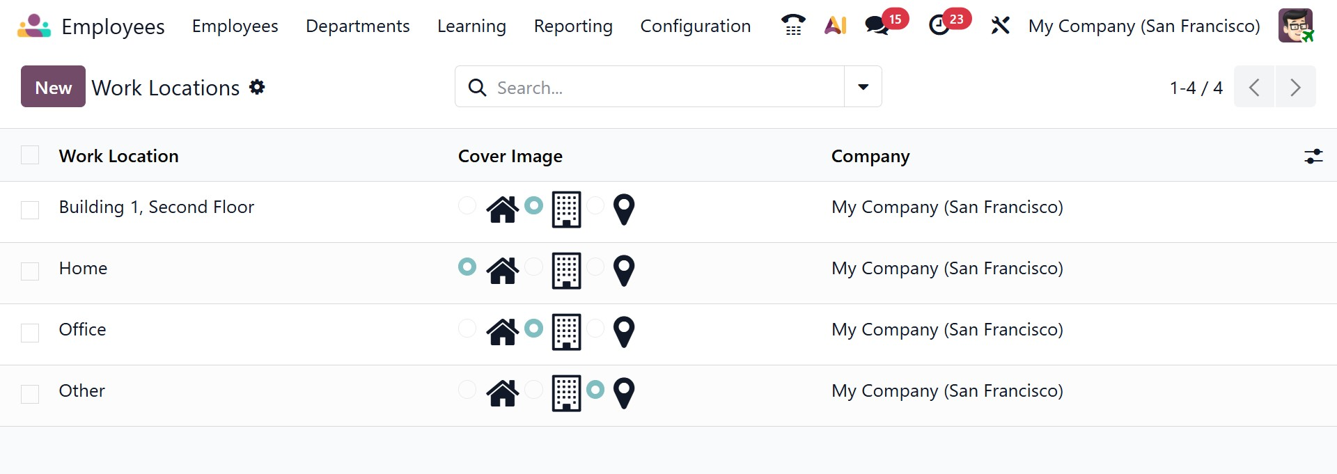 When you click the New button, a configuration form opens where you can create a new work location record. In this window, you can enter the Work Location name to clearly identify the place, such as Head Office, Branch Office, or Remote. You can then specify the Work Address, which links the location to a particular company address for accurate identification and reporting. The Company field automatically displays the related company, ensuring the location is assigned correctly in multi-company environments. Additionally, you can choose a Cover Image using the available icons (such as home, office building, or location pin) to visually represent the type of workplace. Once saved, the new work location becomes available for assignment to employee profiles, helping organizations manage and track employee workplace distribution efficiently.
