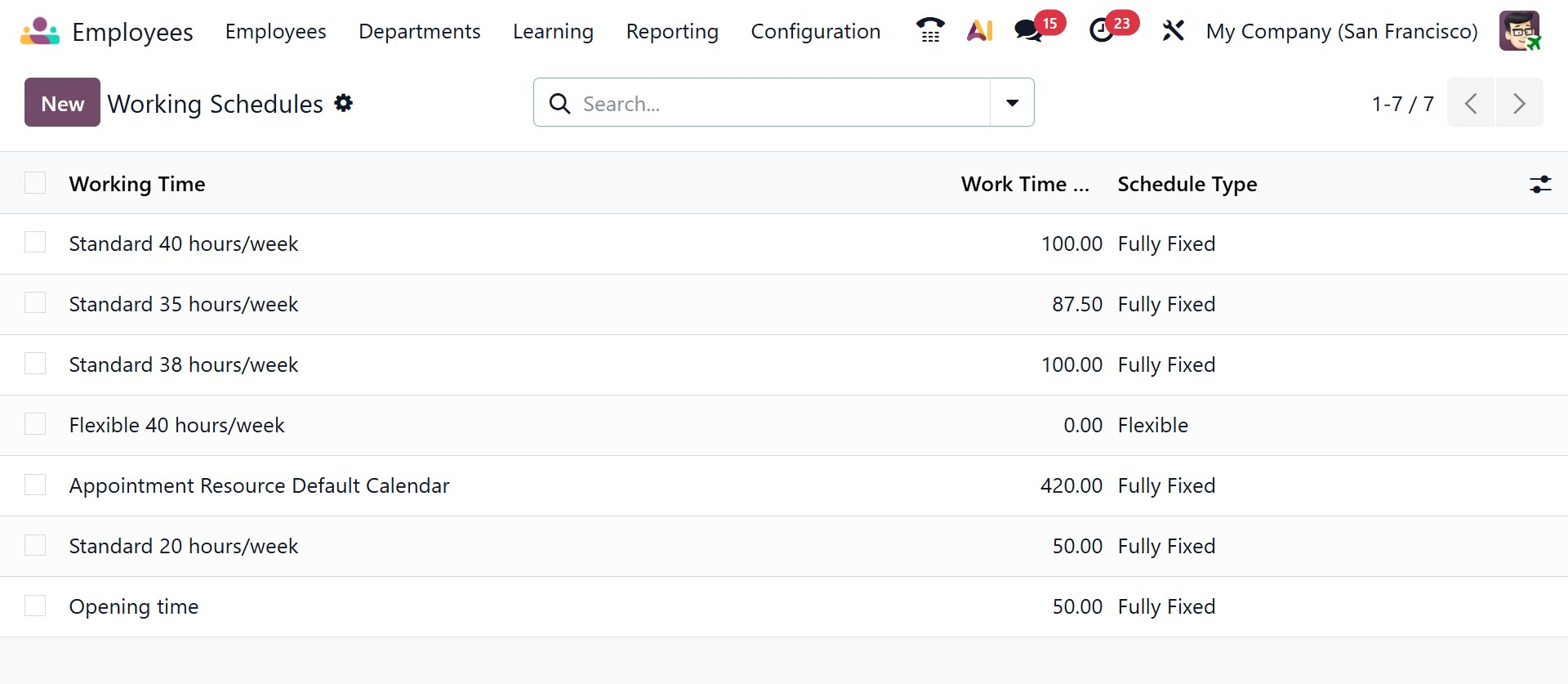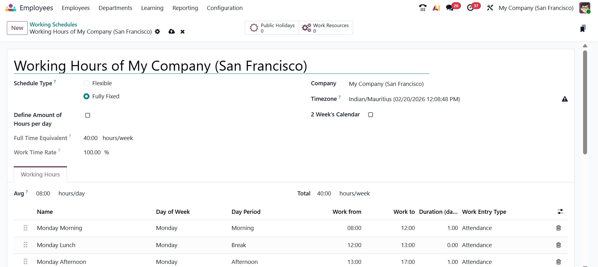 The Working Schedules section allows administrators to define standard working hour patterns within the organization. Common schedules such as 40-hour, 38-hour, or 35-hour workweeks can be created and maintained here. These schedules are then assigned to employees through their contracts, ensuring accurate attendance tracking, payroll calculations, and compliance with labor regulations.