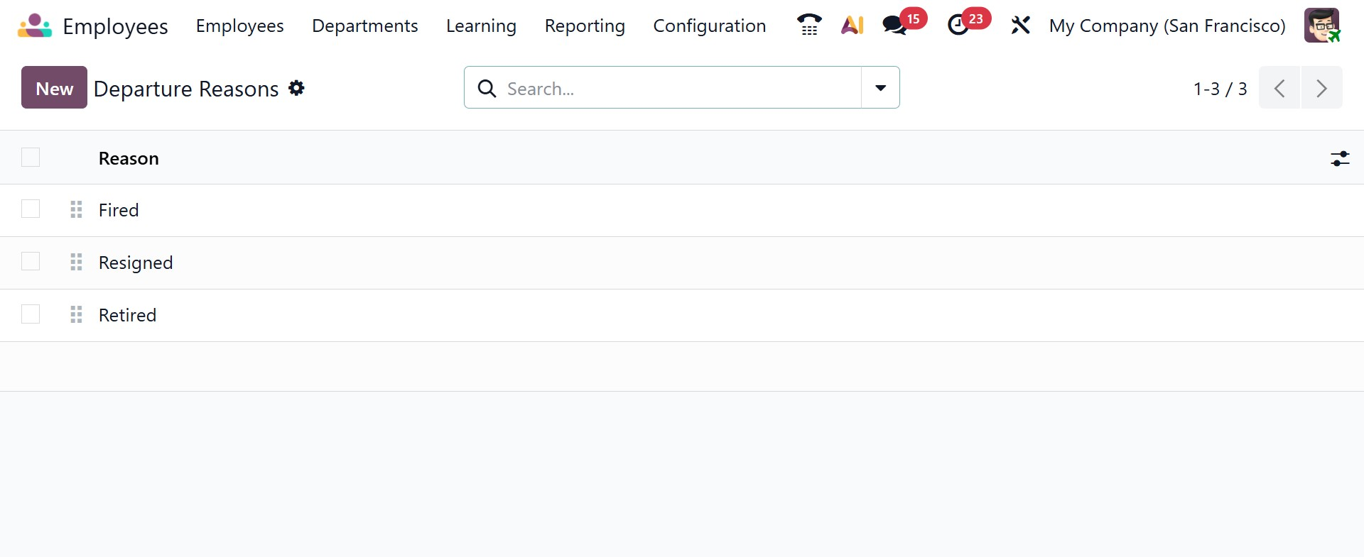 The Departure Reasons configuration helps organizations categorize employee exits. Reasons such as resignation, retirement, termination, or contract completion can be predefined in this section. When an employee record is archived, HR users can select the appropriate departure reason, enabling better reporting and analysis of employee turnover trends.