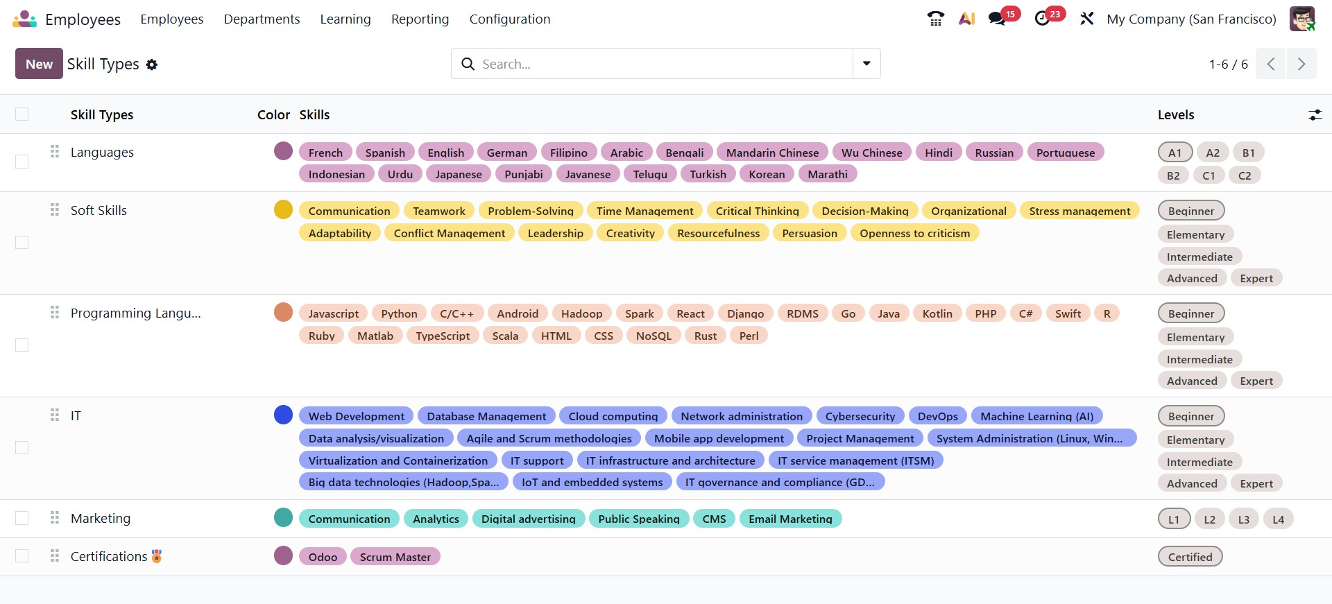 When you click the New button, a configuration form opens where you can create a new skill category by entering the Skill Type Name, selecting a Color for visual identification, and enabling the Certification option if the skill requires certification tracking. The form includes a Skills section where you can add individual skills under the category using the Add a line option, and a Levels section where you define proficiency stages by specifying the Level Name, setting the Progress percentage, and selecting a Default Level if applicable. Once saved, this skill type structure can be used in employee profiles to support organized skill tracking, evaluation, and reporting.
