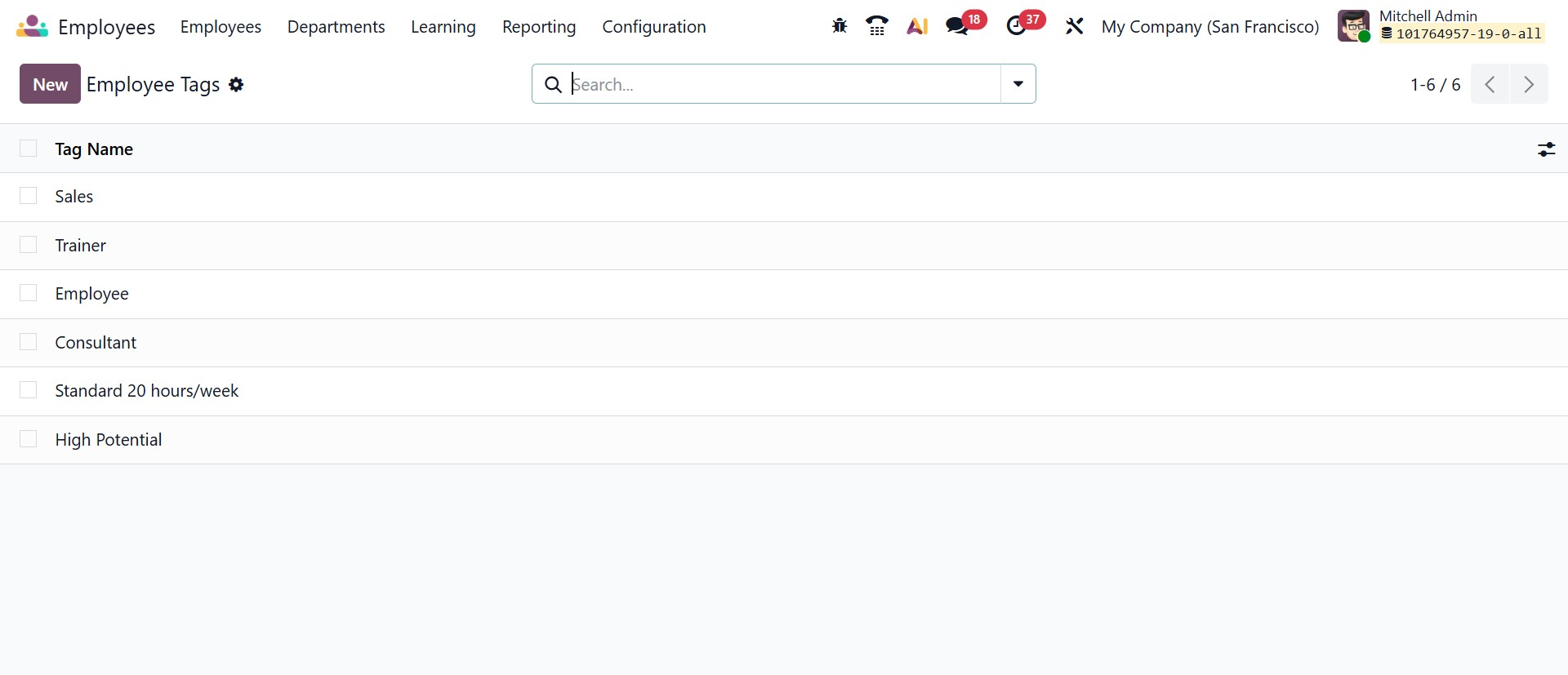 The Employee Tags configuration allows HR teams to create and manage labels that help categorize and organize employees within the system. These tags can represent roles, work schedules, departments, special responsibilities, or classifications such as Sales, Trainer, Consultant, or High Potential. By assigning tags to employee records, organizations can simplify filtering, reporting, and segmentation processes. This structured tagging system improves searchability and supports better workforce organization and analysis.