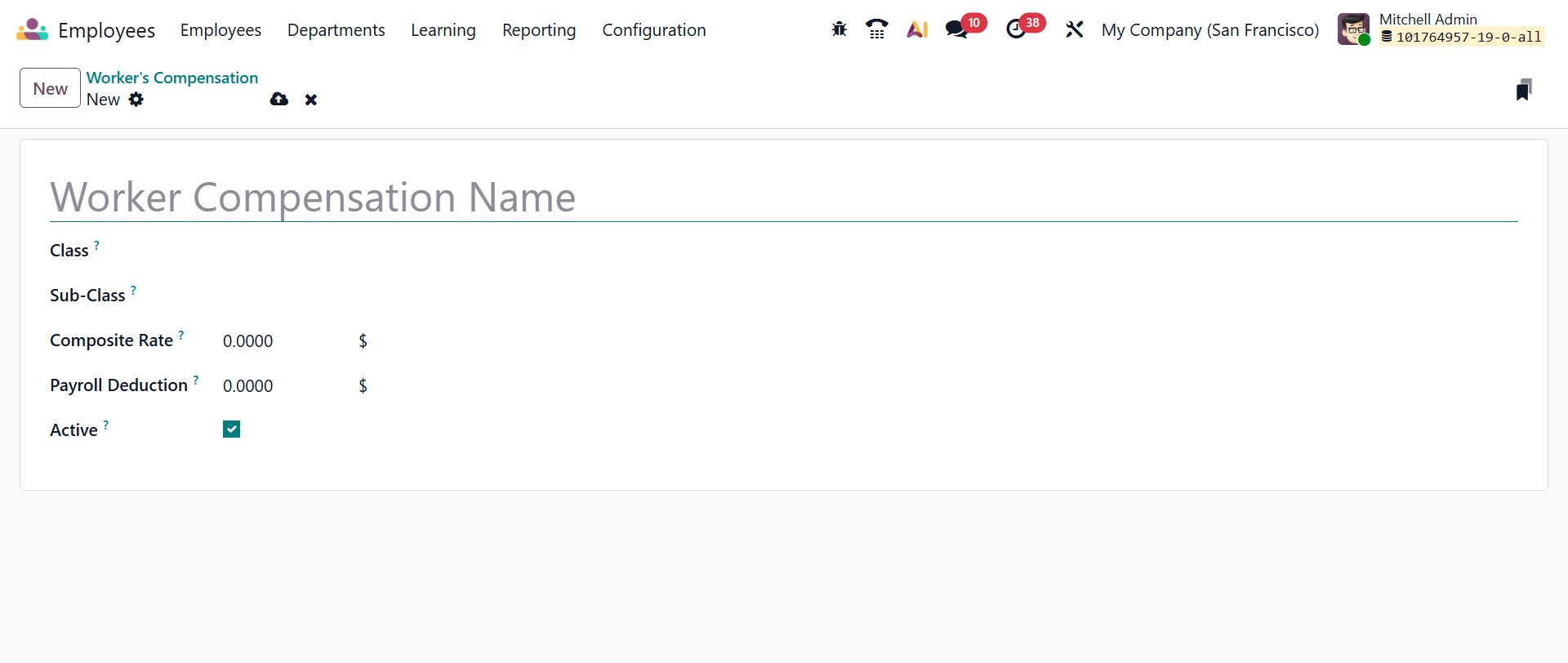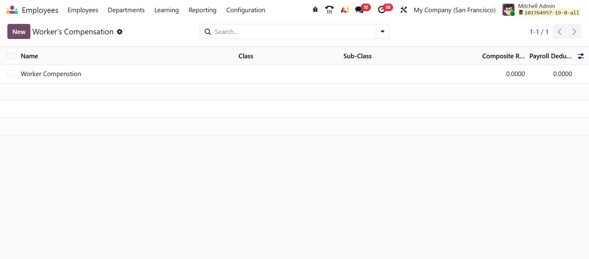 The Worker’s Compensation configuration allows you to create and manage compensation records that can be linked to employee contracts for accurate payroll and insurance processing.