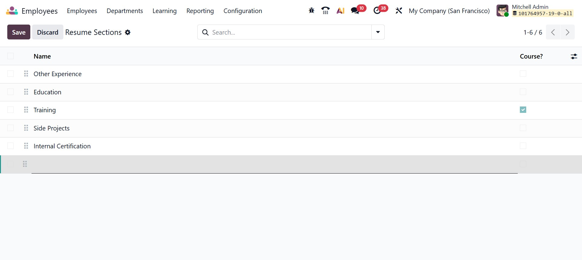 The Resume – Sections configuration in Odoo 19 provides a centralized interface to define and manage the different sections that appear in employee resumes. From this screen, you can view a structured list of existing sections such as Other Experience, Education, Training, Side Projects, and Internal Certification. By clicking the New button, you can create an additional section and specify its name according to your organizational requirements. The list view allows you to easily reorder sections using the drag handle, ensuring the resume layout follows a consistent and logical structure. A dedicated Course checkbox column enables you to indicate whether a particular section is related to courses or training programs, which helps differentiate educational records from other professional details.