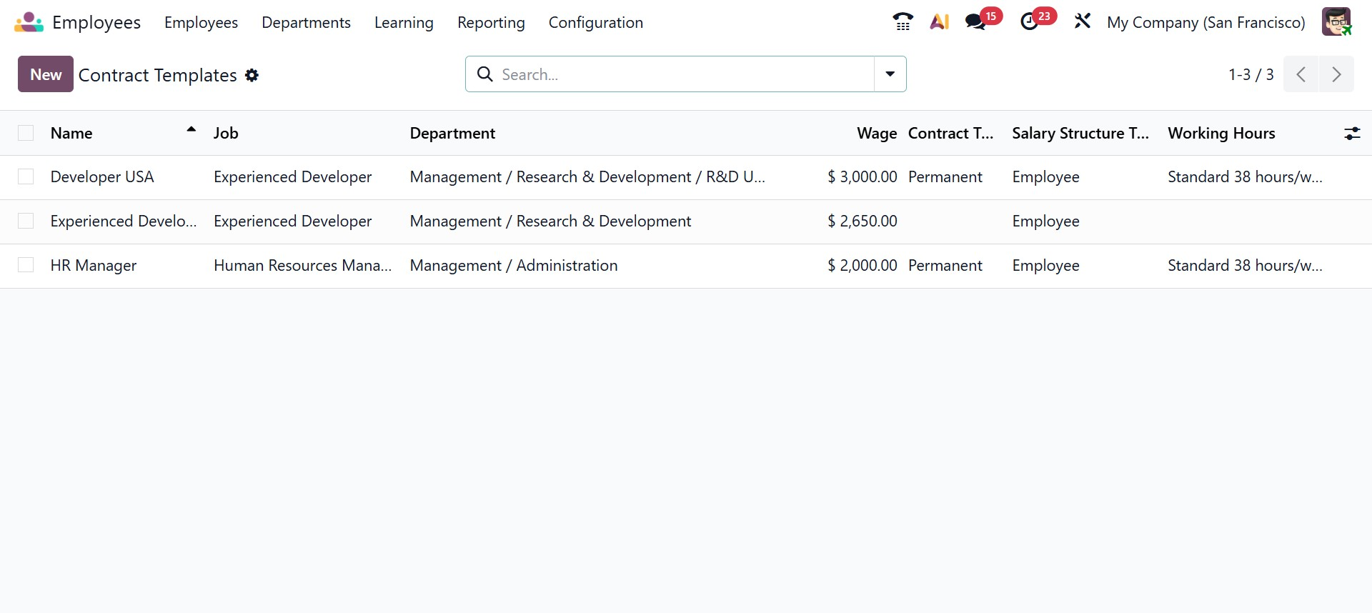 The Contract Templates feature allows organizations to create reusable contract formats for different employee categories. These templates can include predefined salary structures, working hours, benefits, and legal clauses. By using contract templates, HR teams can quickly generate employee contracts while maintaining consistency and reducing the risk of errors.
