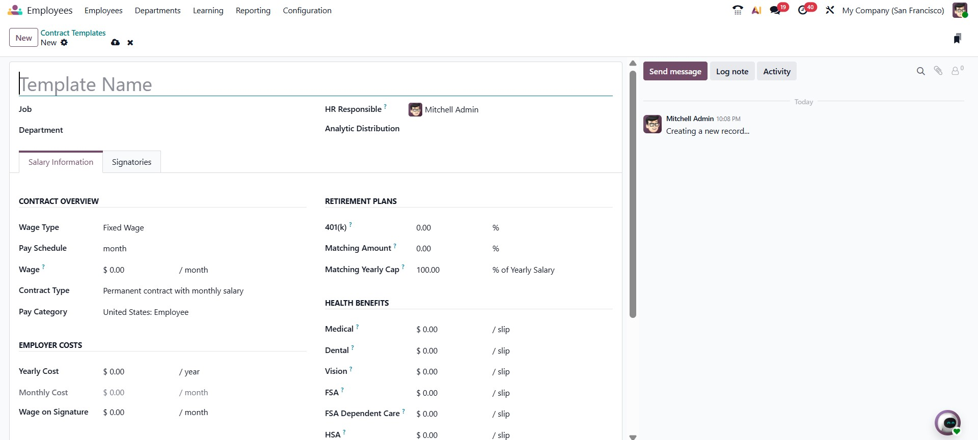 When you click the New button in the Contract Templates menu of the Odoo 19 Employees module, the contract template creation form opens. This window allows HR administrators to define a reusable contract structure that can later be applied to multiple employees. At the top of the form, you can enter the Template Name, select the related Job Position, assign the Department, and specify the HR Responsible person. You can also configure the Analytic Distribution, which helps allocate employee costs across different analytic accounts for reporting purposes.