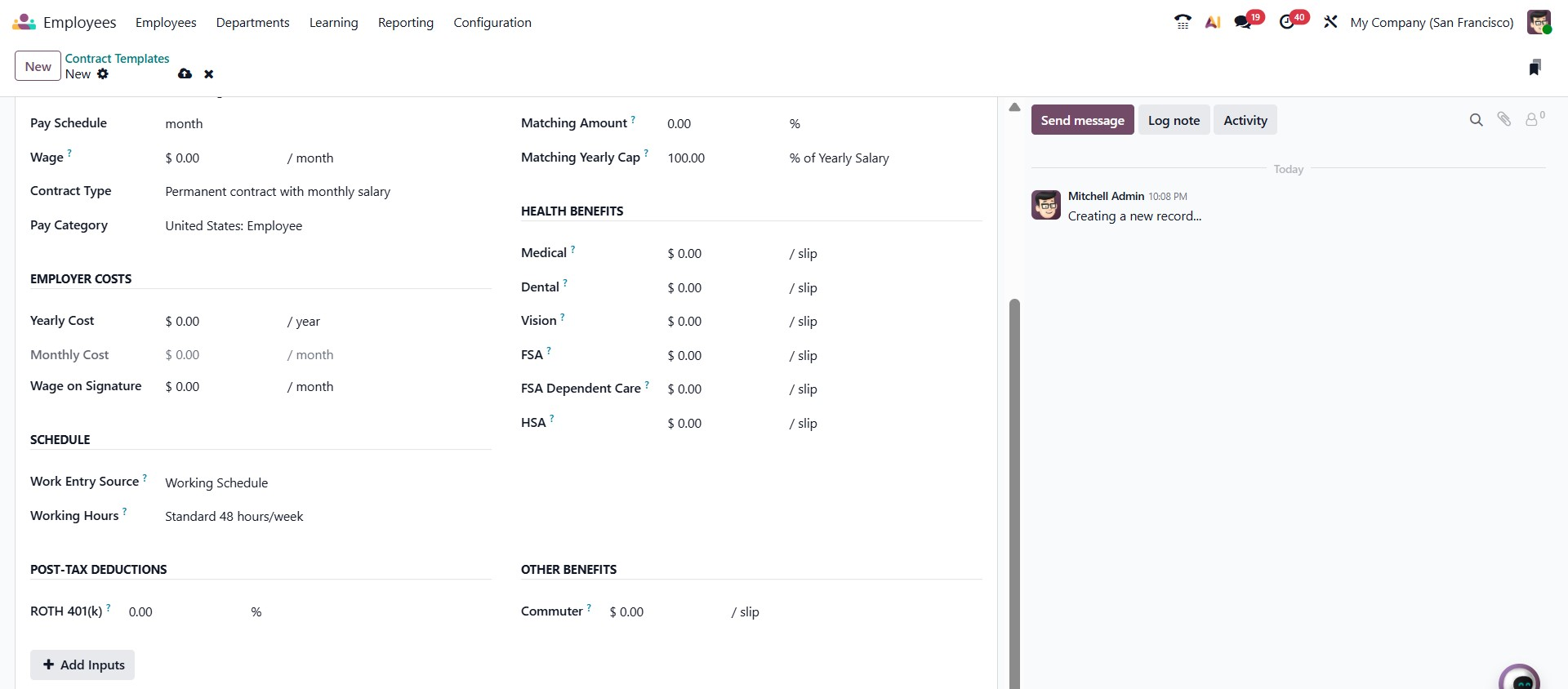 The form also includes benefit-related sections such as Retirement Plans, where you can configure 401(k) contributions, matching amounts, and yearly caps. In the Health Benefits section, you can define medical, dental, vision, FSA, and HSA contributions per payslip. Additional areas, such as Post-Tax Deductions and Other Benefits, allow you to configure deductions like Roth 401(k) and commuter benefits.