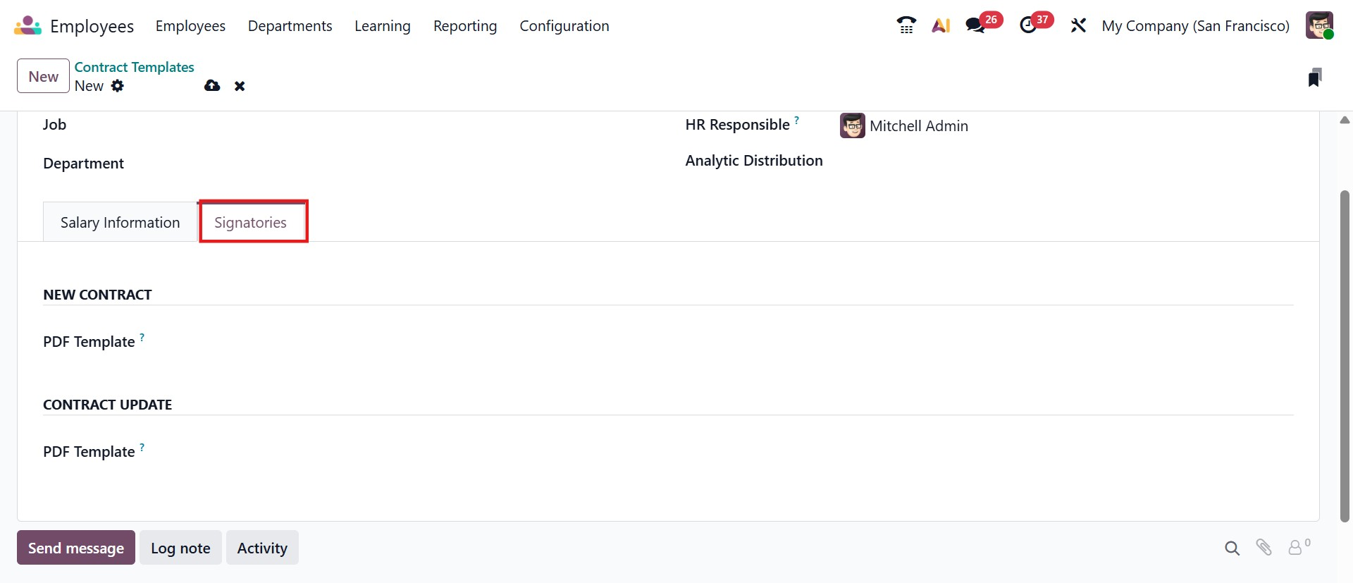 The Signatories tab in the Odoo 19 Contract Template form is used to define the authorized signers and PDF templates associated with employee contracts created from this template. In the New Contract section, you can assign a specific PDF Template that will be used when generating a new contract, ensuring that the document follows a standardized structure with predefined signature placeholders. Similarly, the Contract Update section allows you to select a separate PDF template for contract amendments or modifications, maintaining consistency during updates. By configuring this tab, HR teams can streamline the contract signing process, ensure compliance with company policies, and automatically apply the correct document format whenever the template is used.