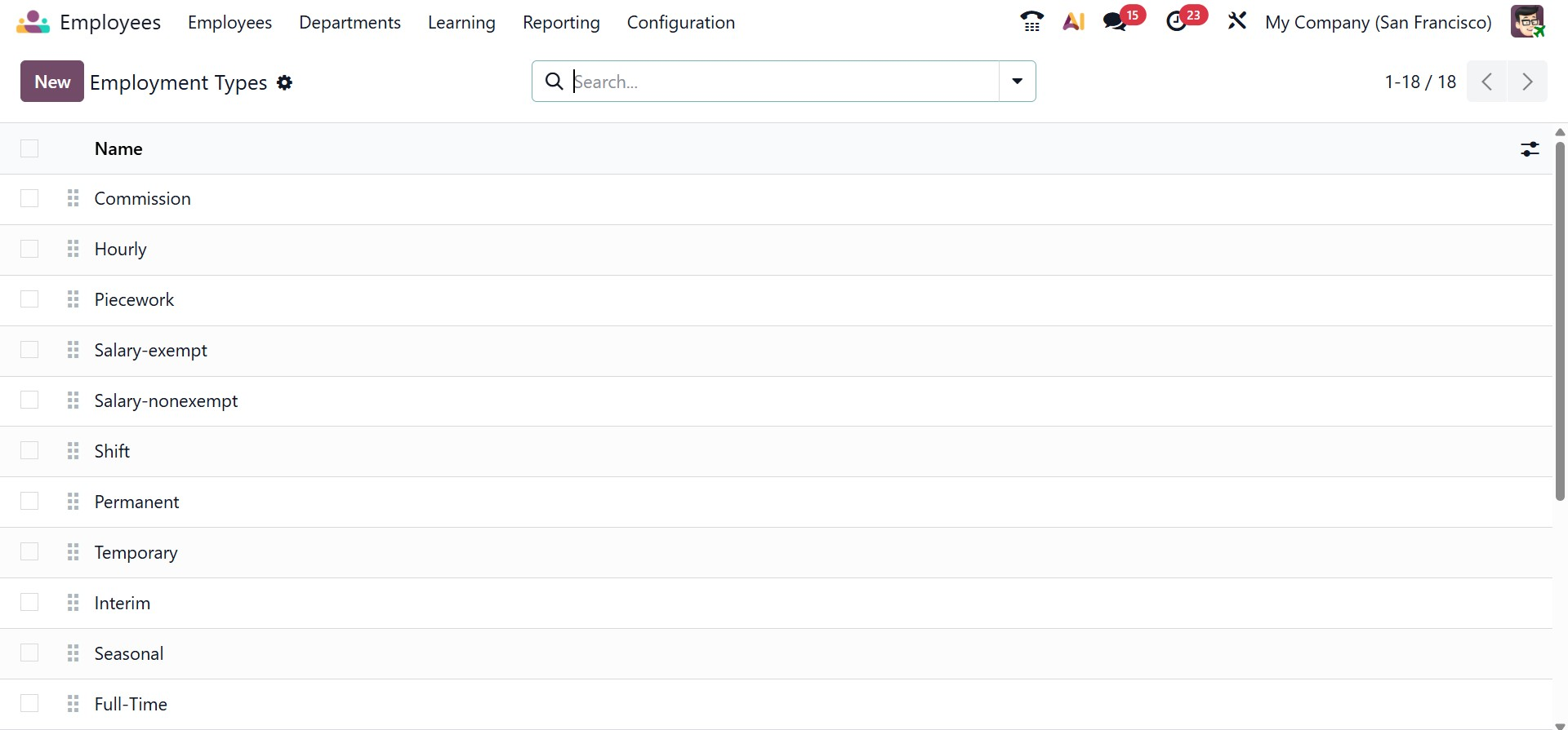 The Employment Types option enables organizations to define various categories of employment, such as permanent, temporary, interim, seasonal, or full-time roles. These employment types can then be linked to employee contracts, helping HR teams clearly differentiate workforce categories and manage compliance, payroll, and benefits accordingly.