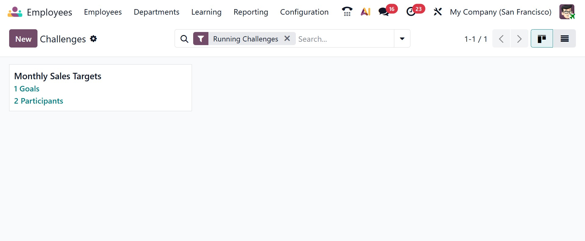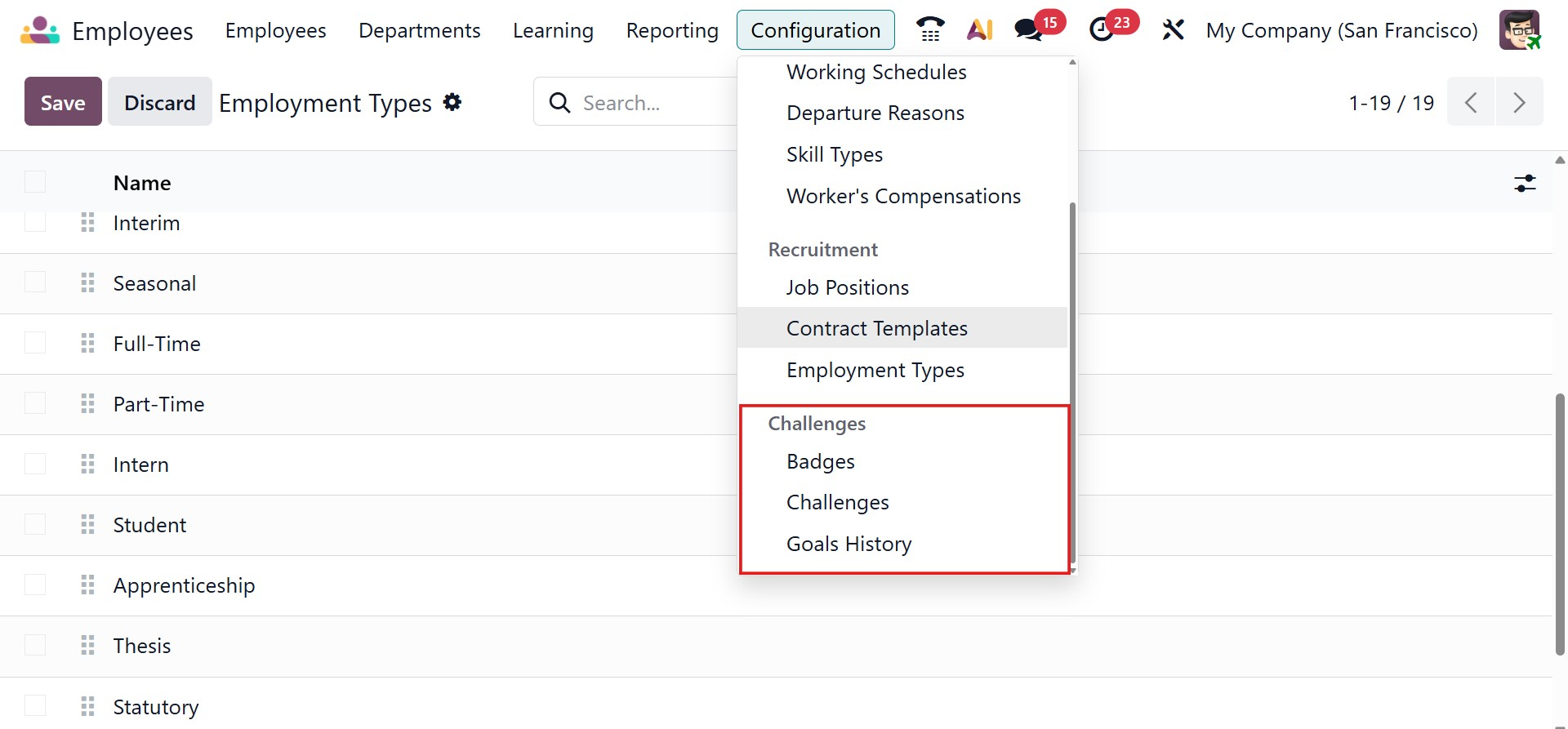 The employee module includes the Challenges option in the Odoo Employee Configuration menu. It enables companies to set performance-based goals for staff members, monitor their development, and give them badges, points, or ranks as rewards. This feature is intended to increase engagement, inspire workers, and increase output. The page will be, as in the image below.