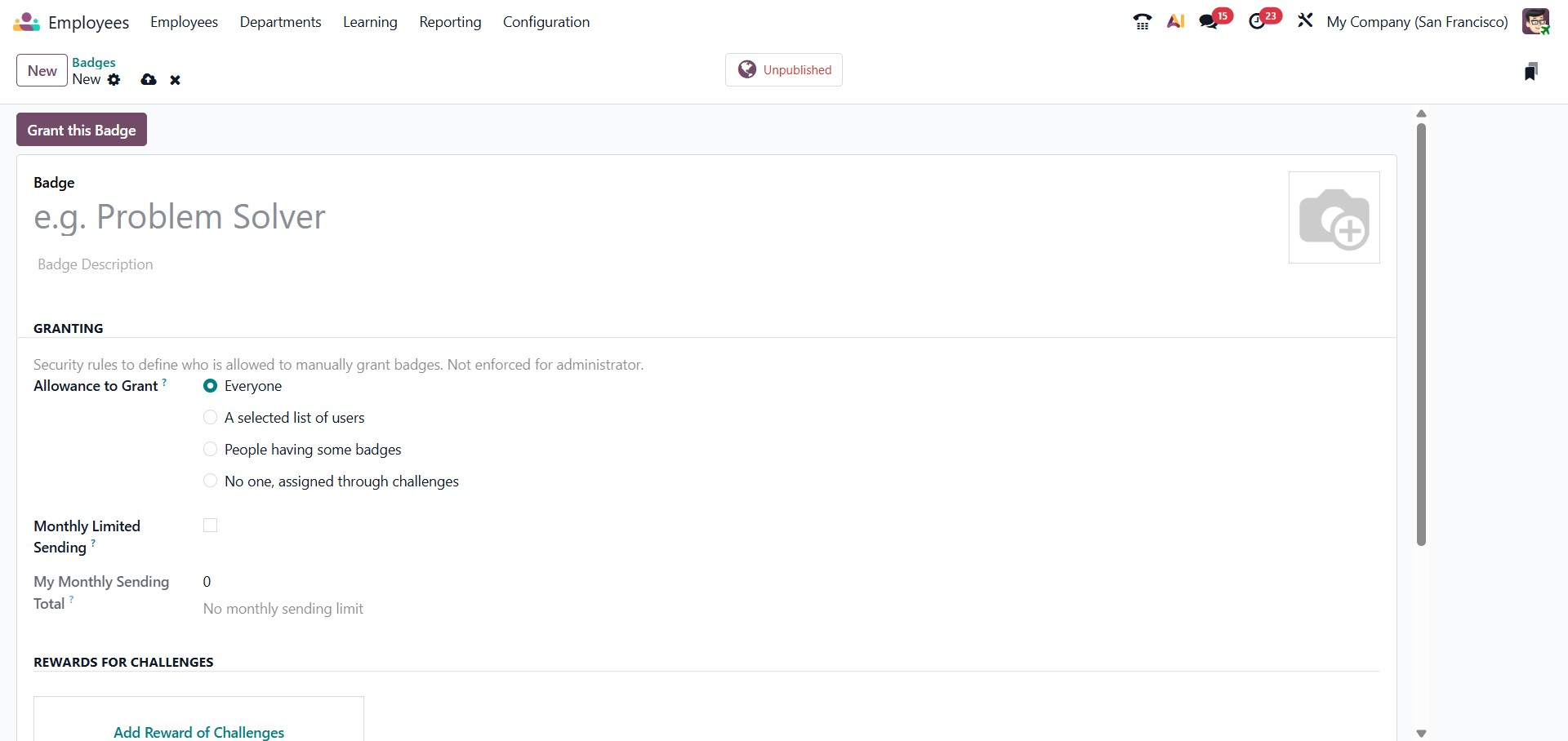 In the Granting section, you can control who is allowed to manually assign the badge. The Allowance to Grant option lets you choose whether the badge can be granted by everyone, only by a selected list of users, by users who already hold certain badges, or by no one if it is intended to be awarded automatically through challenges. Additionally, the Monthly Limited Sending option can be enabled to restrict how many times a badge can be granted within a month, ensuring fair and controlled distribution.