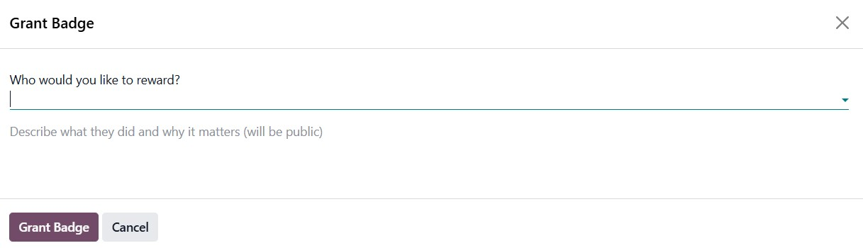There, the administrator can grant a badge to an eligible employee by clicking on the Grant Badge button. This will give a pop-up, as shown below.