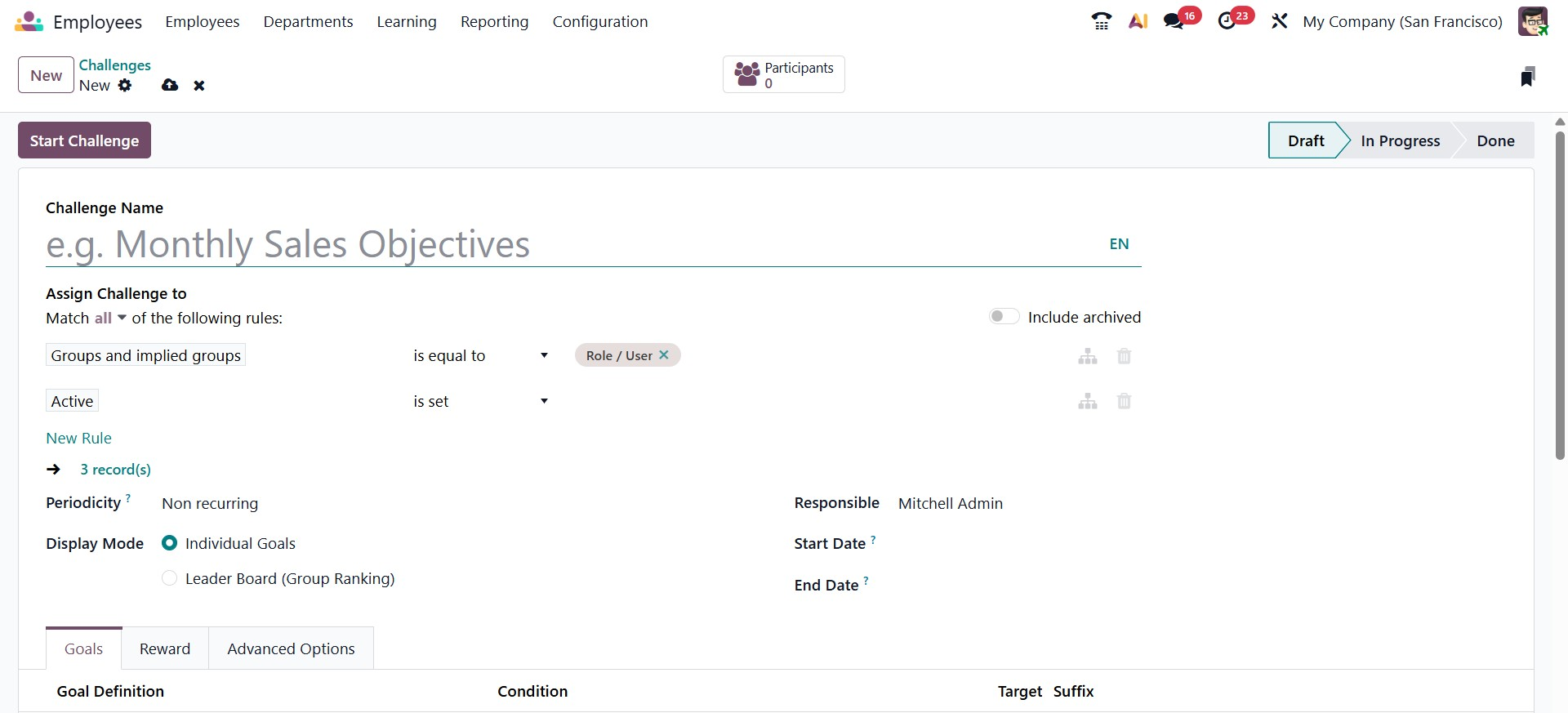 You will see a designated space to enter the Challenge Name here. You can configure users to allow Odoo to assign challenges to the records that match by using the Add Filter option. The Periodicity parameter allows you to specify the time frame for automatic challenge assignment. Daily, weekly, monthly, or annual are all possible. If you would like not to repeat the challenge, you may also set it to Non-Recurring. Leader Boards or Individual Goals can be selected as the Display Mode. The Responsible column allows you to specify which employee is responsible for handling this challenge. The Start and End date fields can be used to add the challenge's duration.