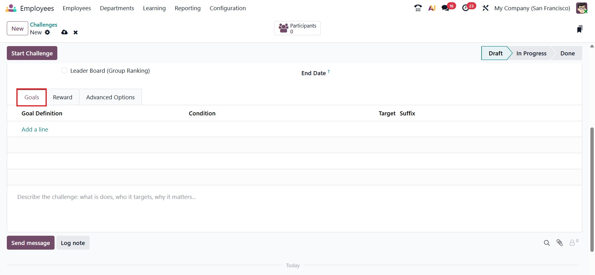 The Add a Line button on the Goals tab allows you to describe the challenge. It will assist a user in comprehending the challenge's requirements. Goal Definition, Condition, Target, and Suffix are all included.