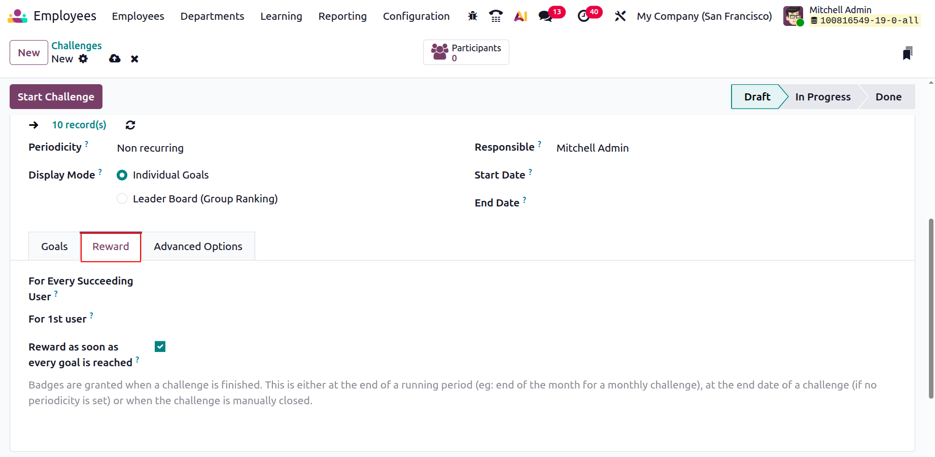 You may add the challenges' rewards under the Reward tab. Rewards can be specified for the first user and for each subsequent user. You can activate the reward as soon as each goal is accomplished if you want to give the worker a reward when the goal is finished.