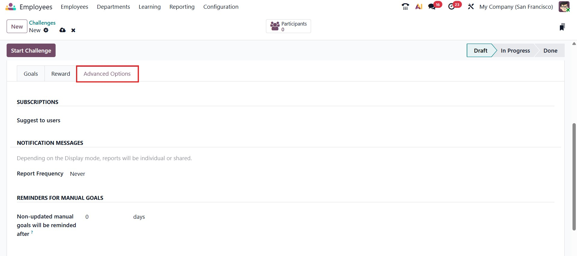You can invite people by entering their IDs in the Suggest to people section under the Advanced Options tab. To alert the staff, place a notification message in the designated area. You can also configure the Report Frequency in addition to this. In the relevant field, set reminders for the manual goals. Lastly, use menus to specify the challenge's visibility.
