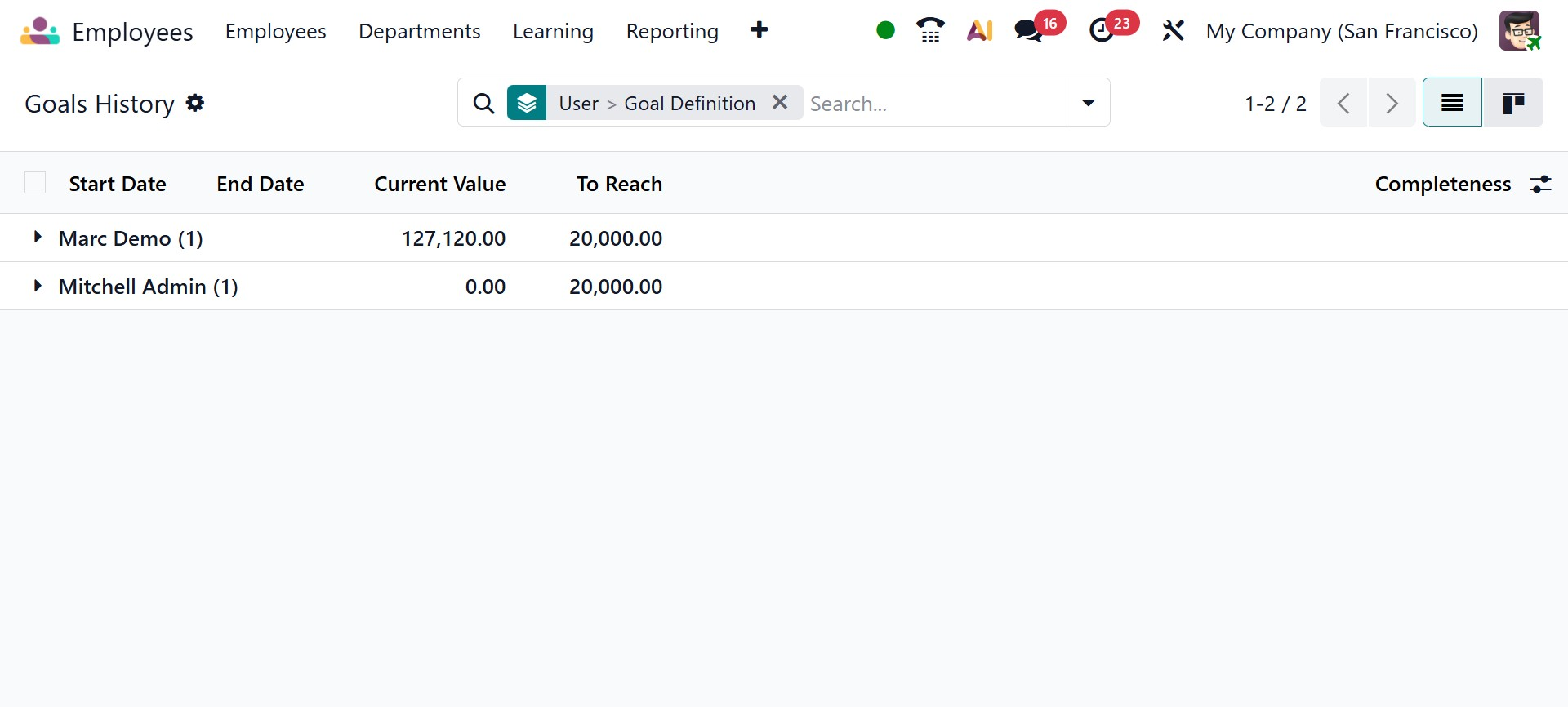 This platform allows you to examine each employee's performance level. Dates of Start and End, Current Value, To Reach, and Completeness are displayed. Employee motivation will be maintained by displaying goal history.