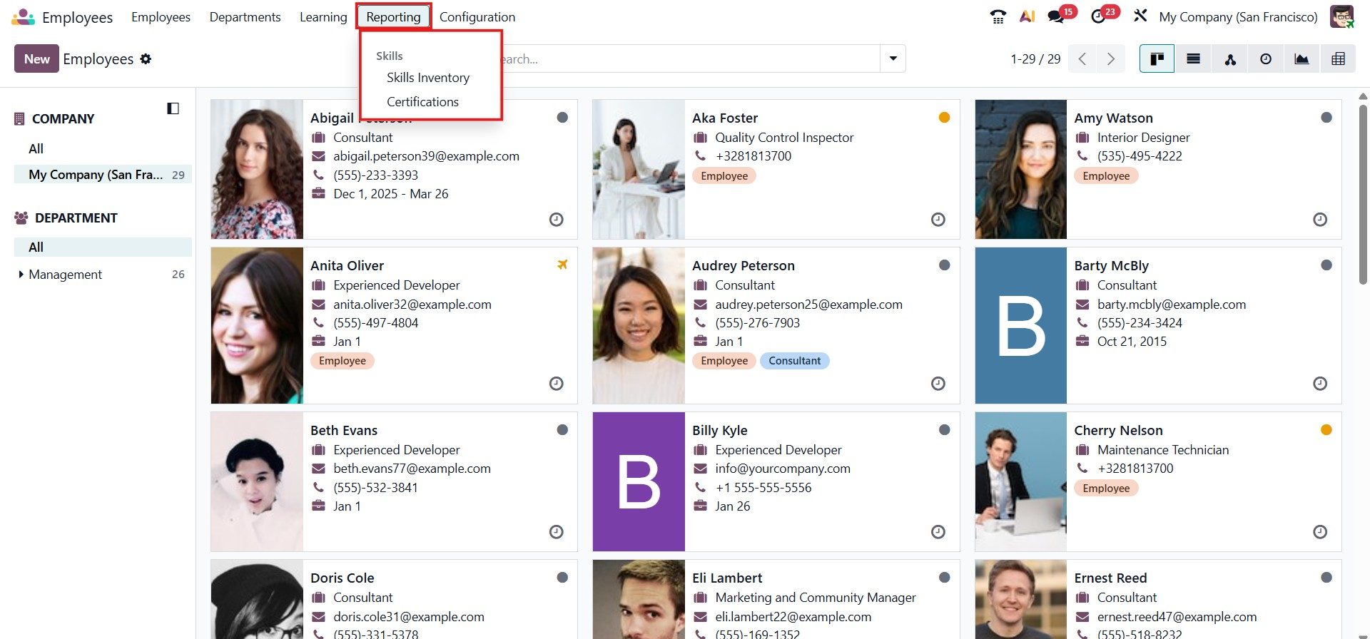 The Reporting section of the Odoo 19 Employee module provides powerful analytical tools to gain insights into employee skills and certifications, helping organizations make informed workforce decisions.
