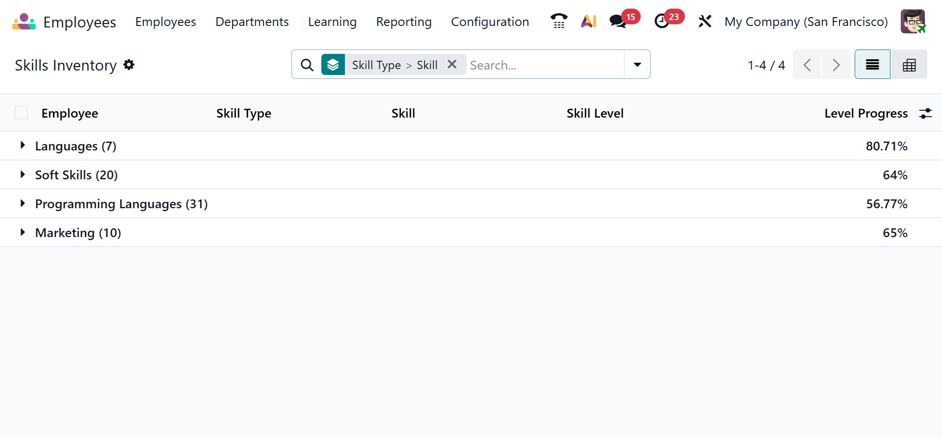 The Skill Inventory report offers a comprehensive overview of the skills available within the organization. It supports both List and Pivot views for flexible analysis. In the list view, skills are organized by categories such as programming or technical skills, which can be expanded to view individual skills like Java, Python, HTML, or CSS. These entries can be further expanded to reveal the employees who possess each skill, along with their corresponding proficiency levels. This report is especially useful for assessing internal expertise, planning projects, and identifying skill gaps.