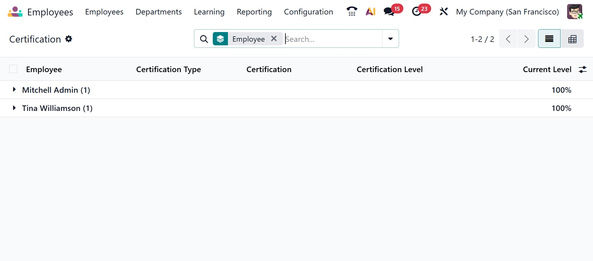 The Certifications report enables users to review certifications held by employees across the organization. From this view, you can expand each employee record to see the specific certifications assigned to them, such as professional or system-specific certifications. Only certifications belonging to active, hired employees are displayed, ensuring accurate and relevant reporting. This section also includes a Pivot view, allowing users to analyze certification data from different perspectives, such as by employee, certification type, or validity period.
