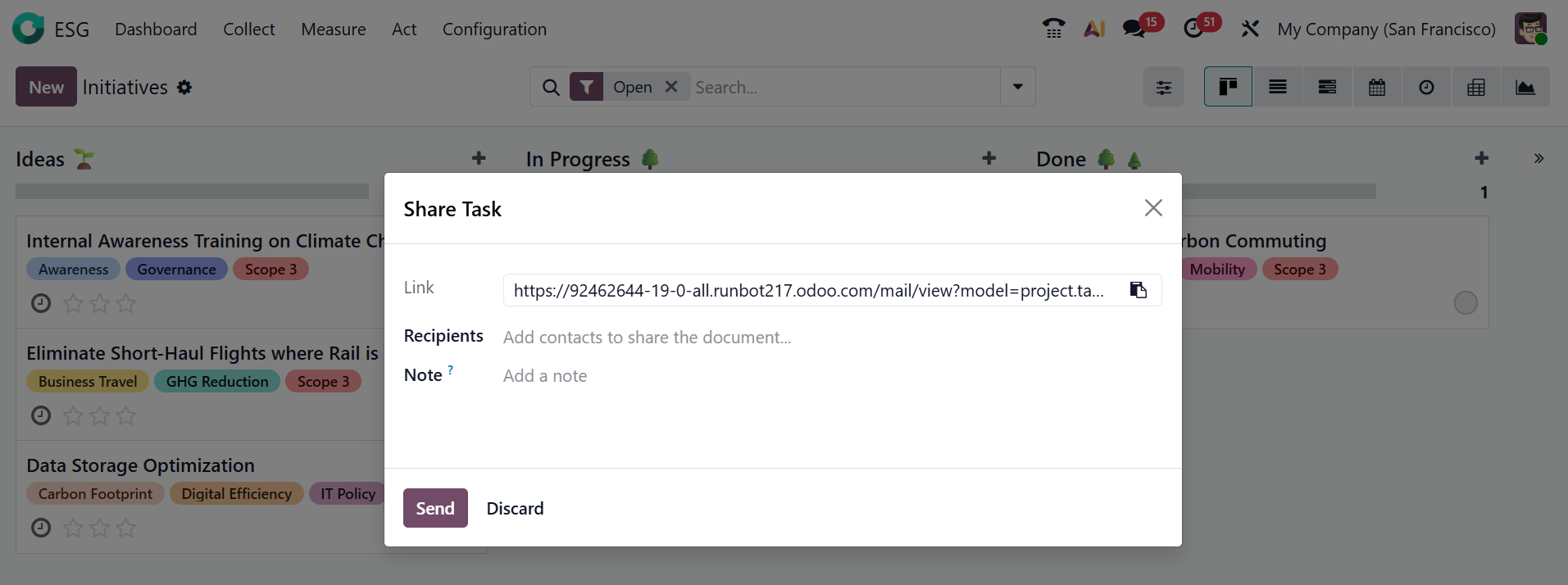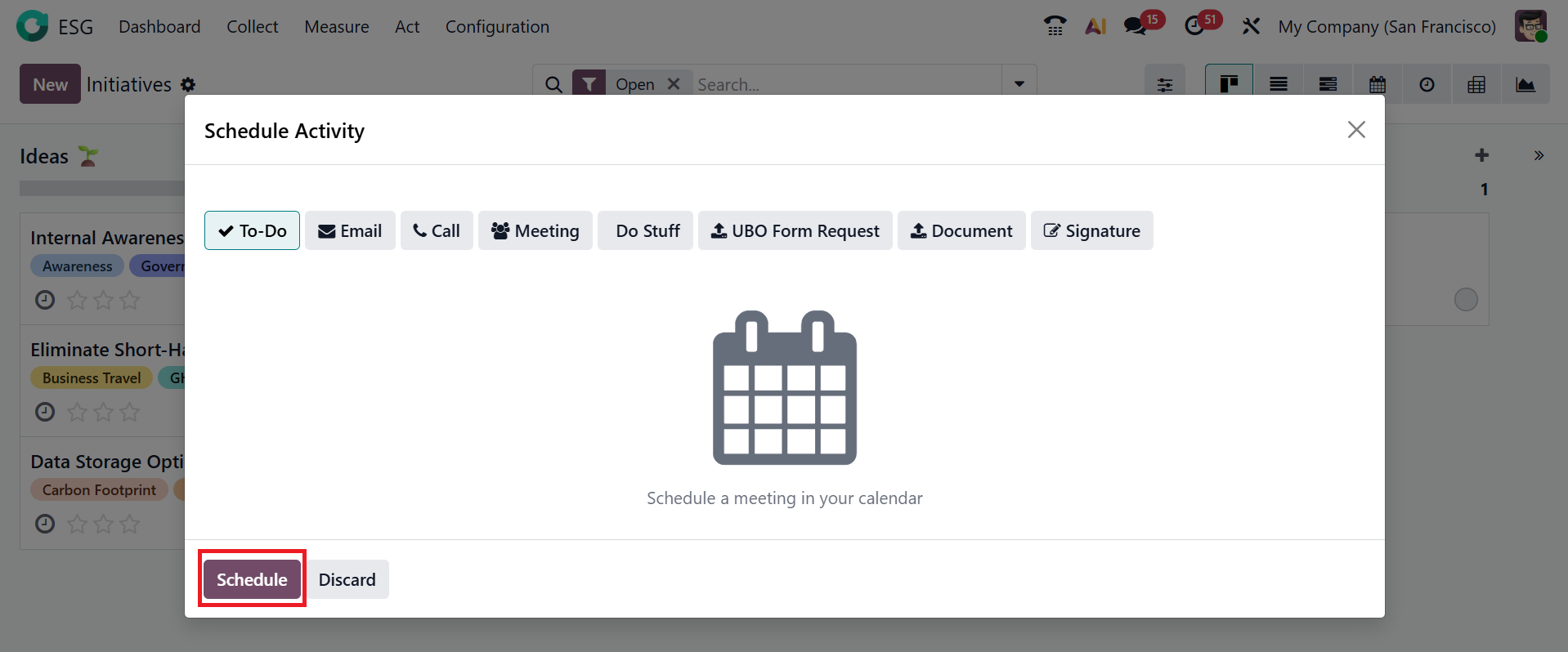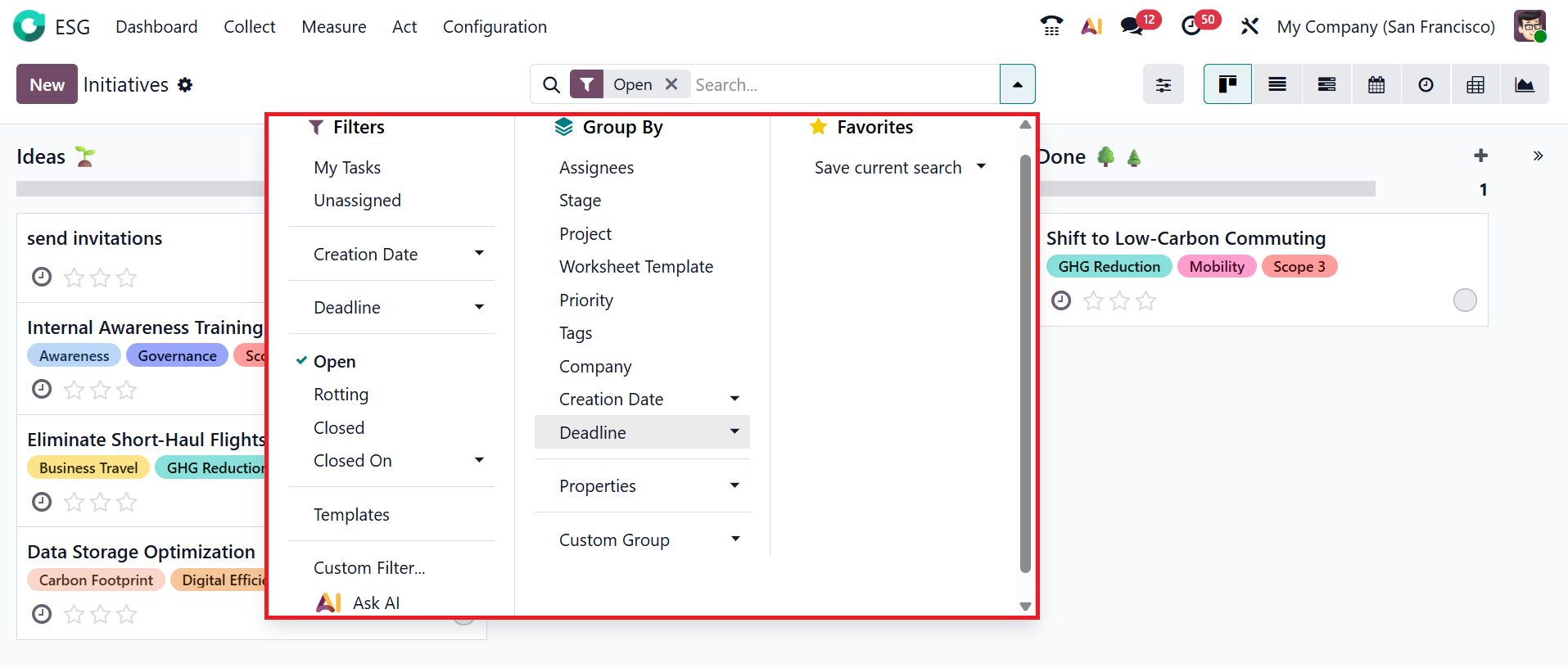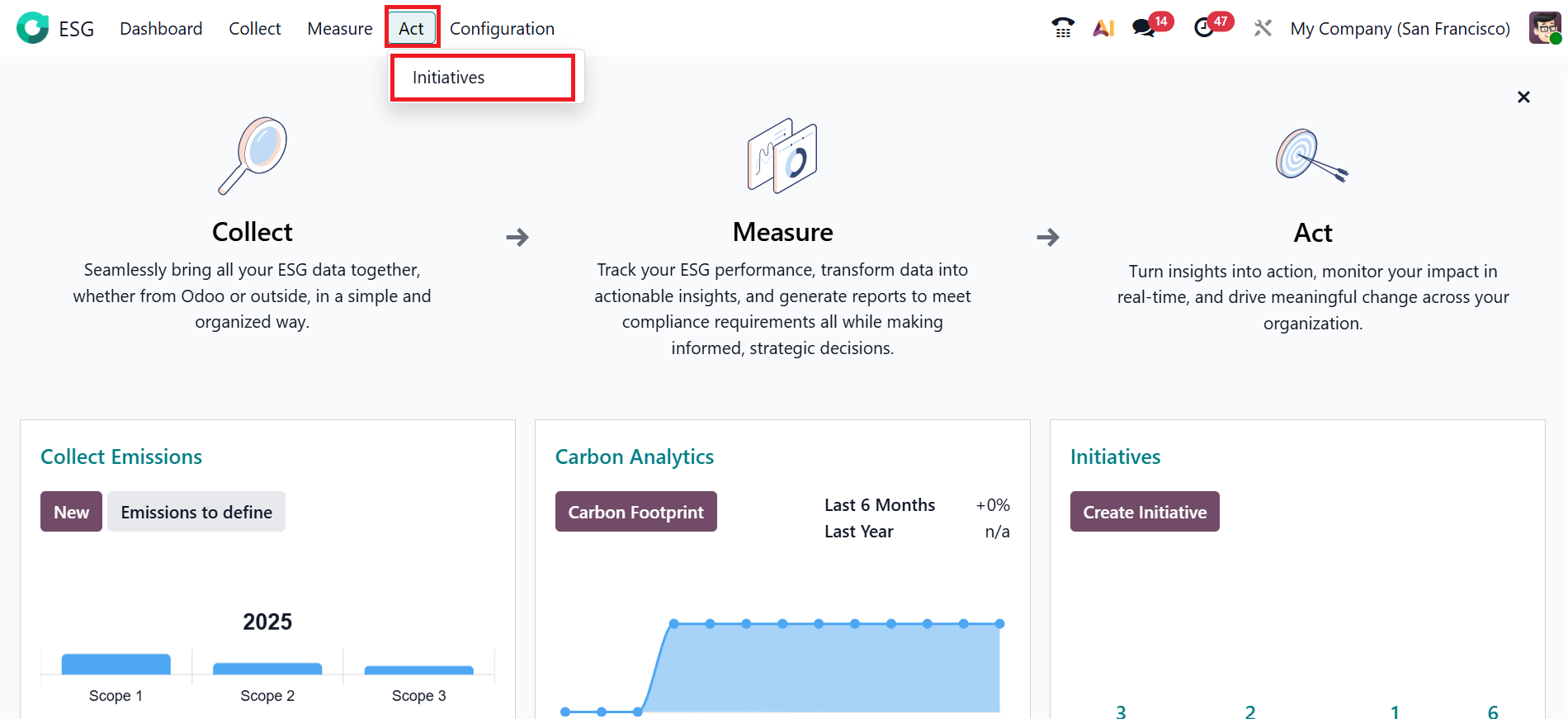 The Act menu in the Odoo 19 ESG module represents the final step of the ESG process, where the company can take actions and plans based on the results from the Collect and Measure stages. Under the Act menu, you can view the Initiatives option.