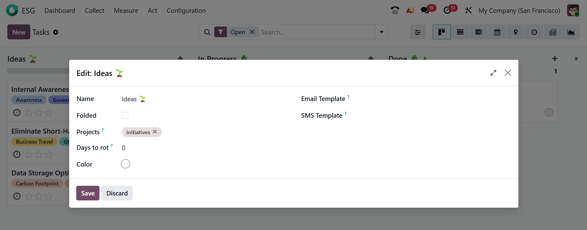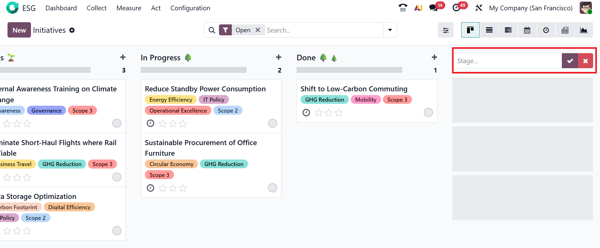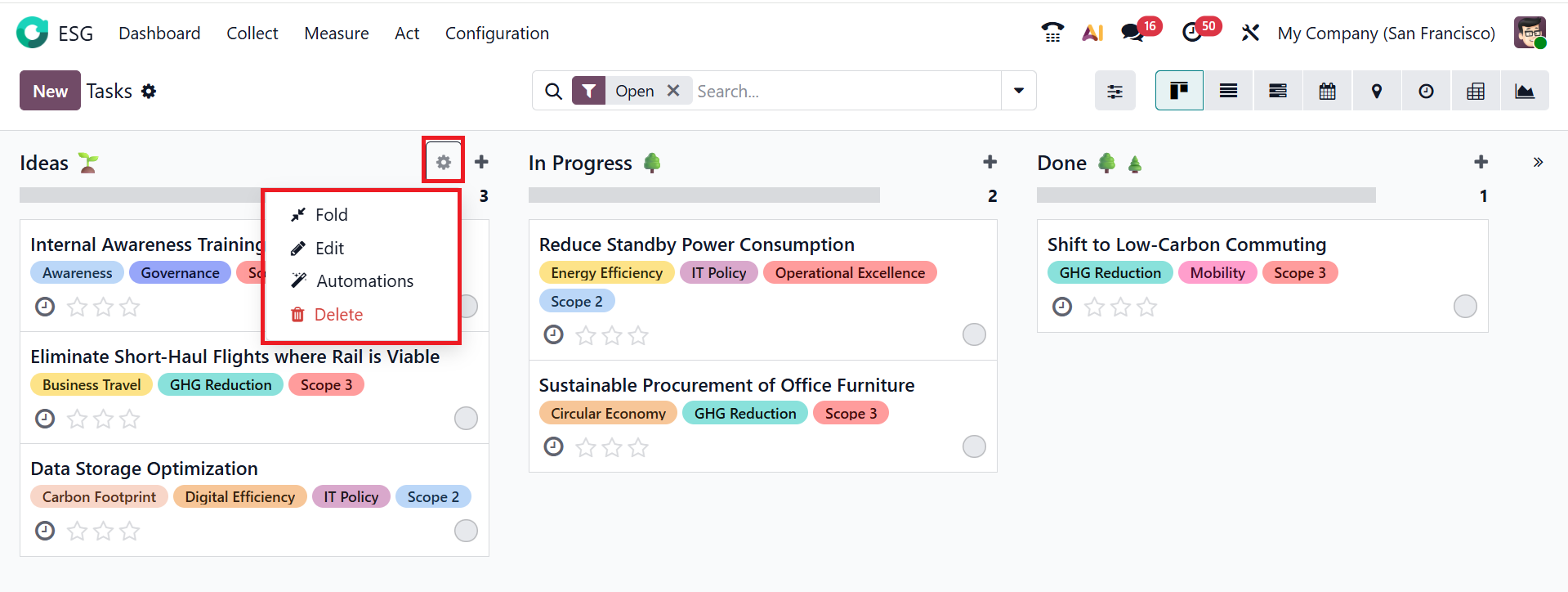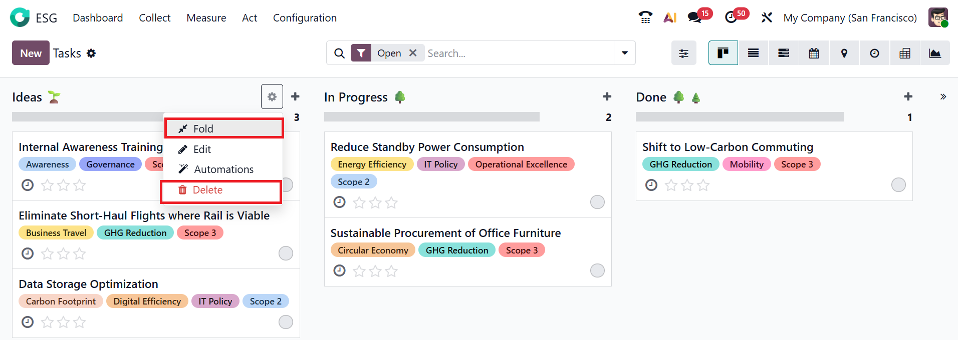 Click on the Fold button to temporarily hide a stage in a Kanban view. This helps you focus only on the stages you need to see and makes the ESG initiatives dashboard less crowded. To permanently delete a stage, click on the Delete button.