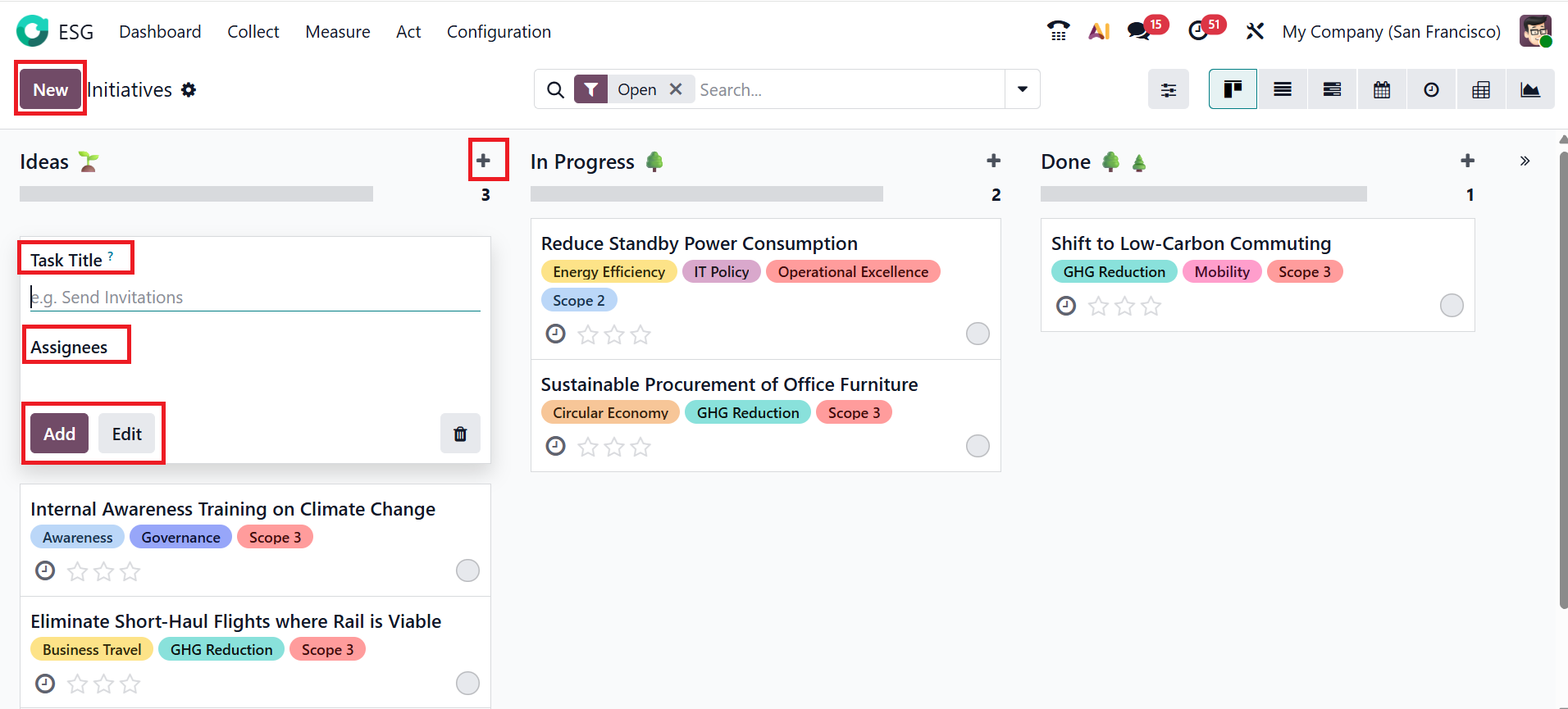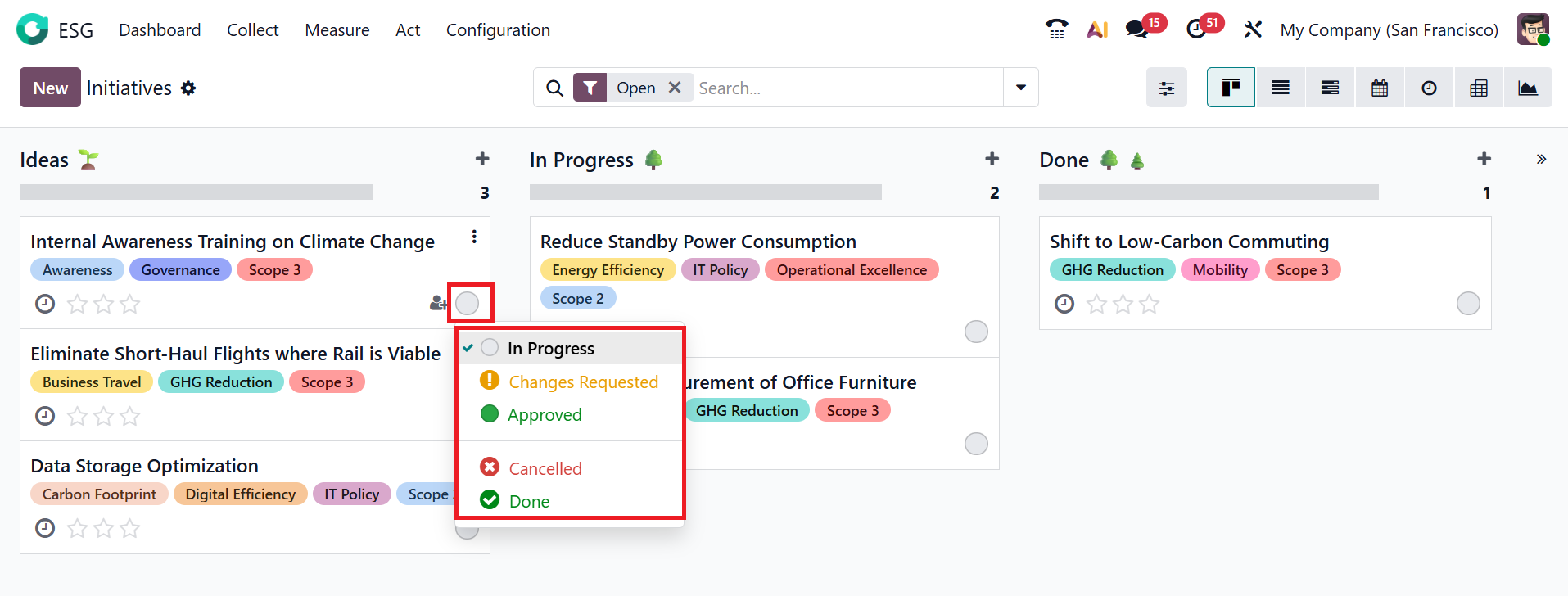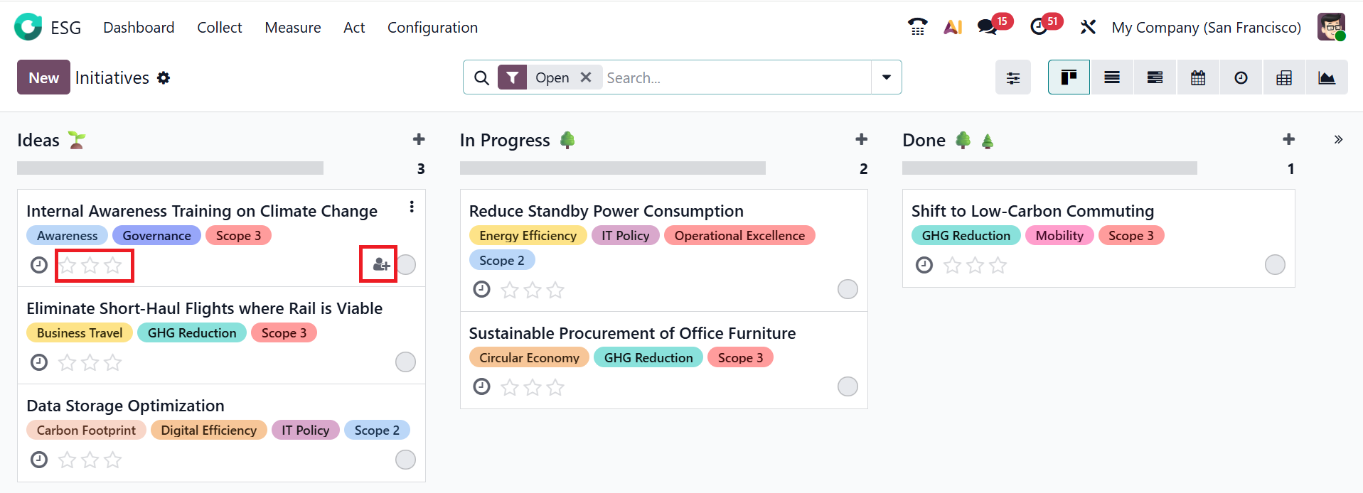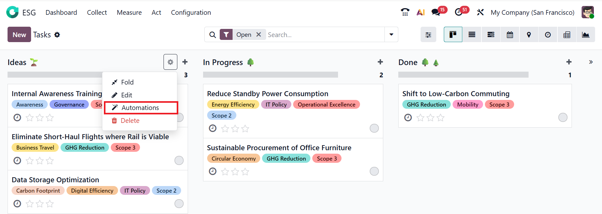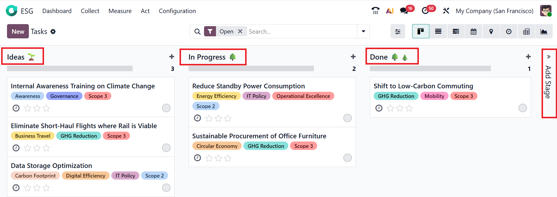 Click on the Fold button to temporarily hide a stage in a Kanban view. This helps you focus only on the stages you need to see and makes the ESG initiatives dashboard less crowded. To permanently delete a stage, click on the Delete button.
