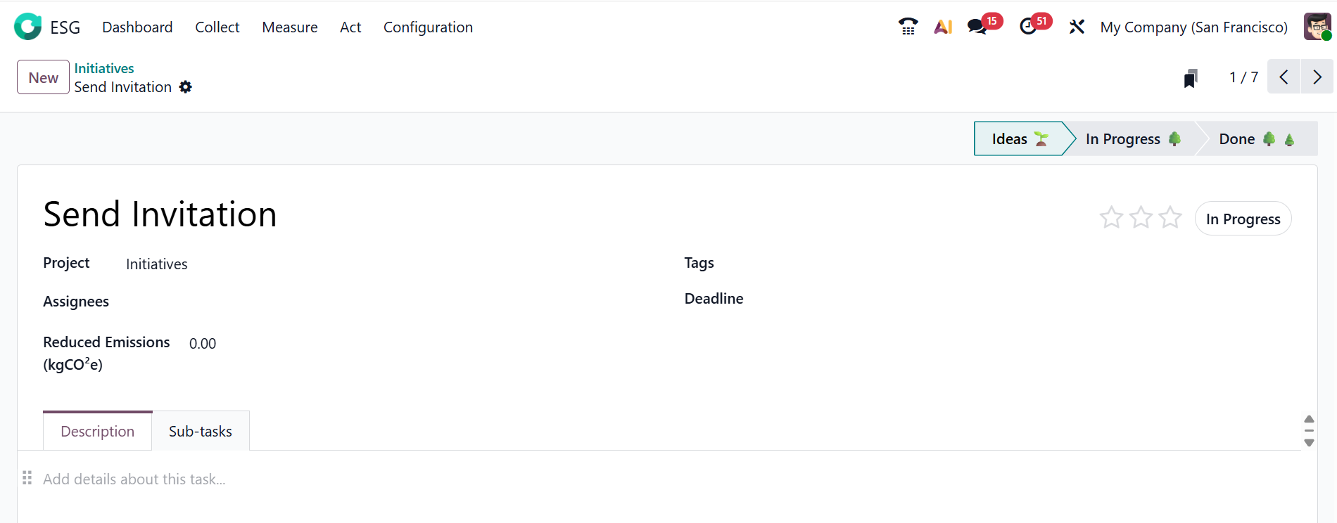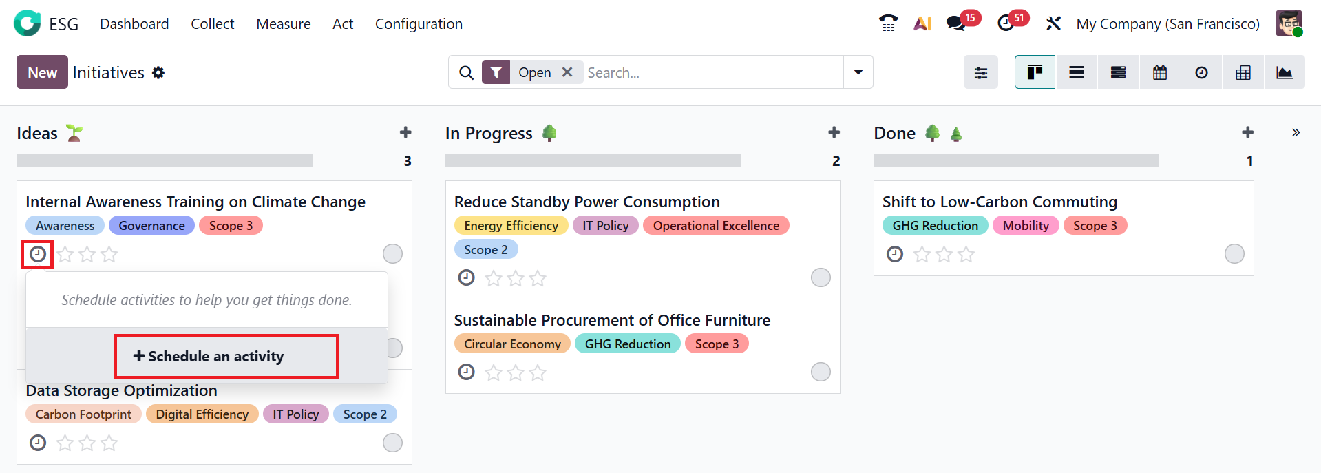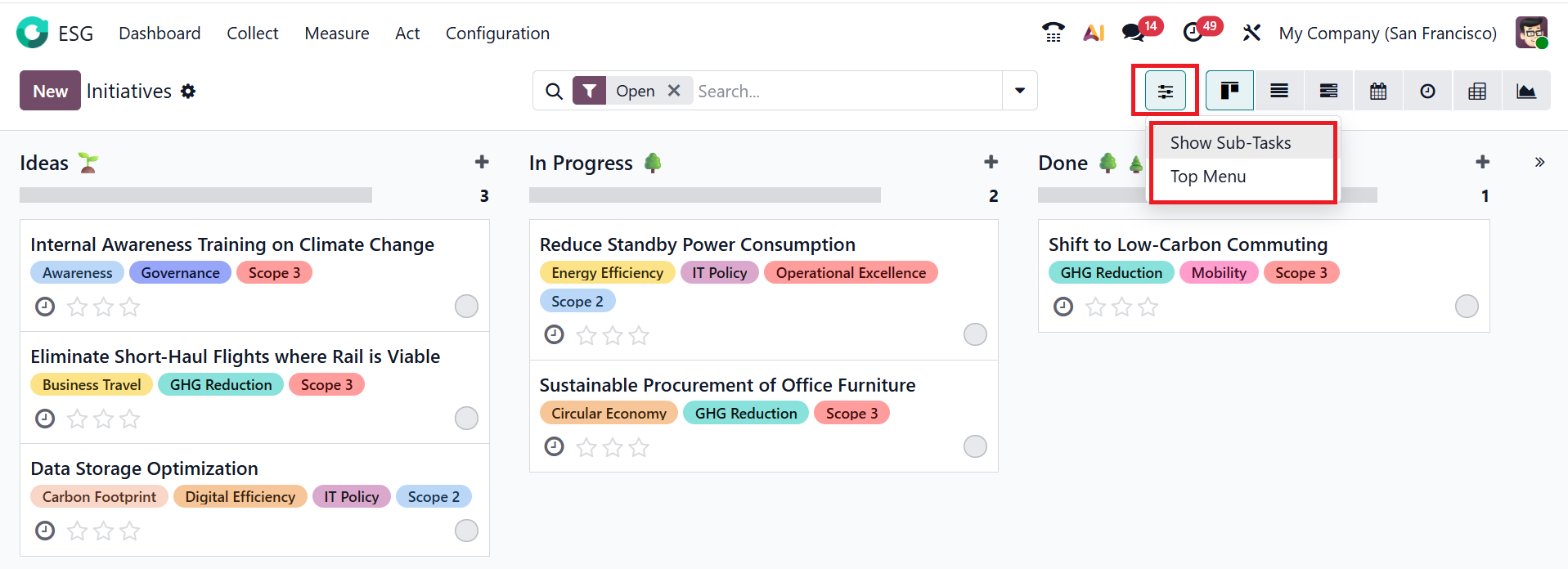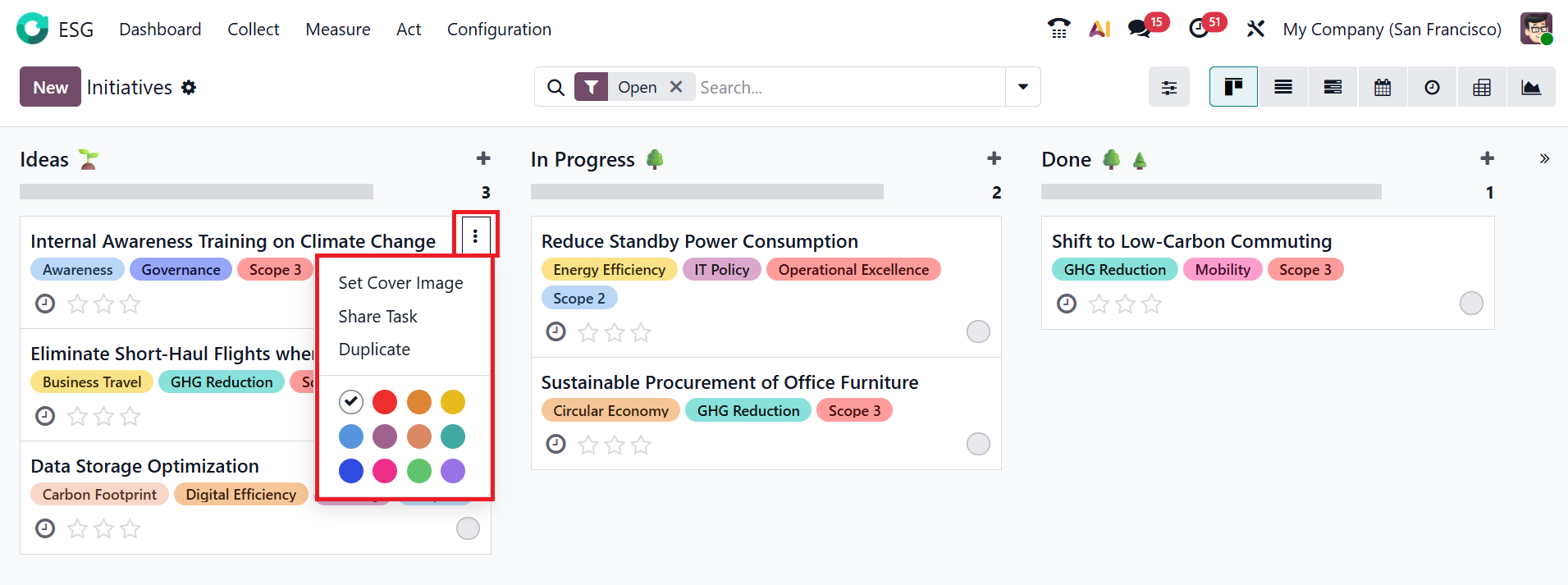 Click on the Fold button to temporarily hide a stage in a Kanban view. This helps you focus only on the stages you need to see and makes the ESG initiatives dashboard less crowded. To permanently delete a stage, click on the Delete button.
