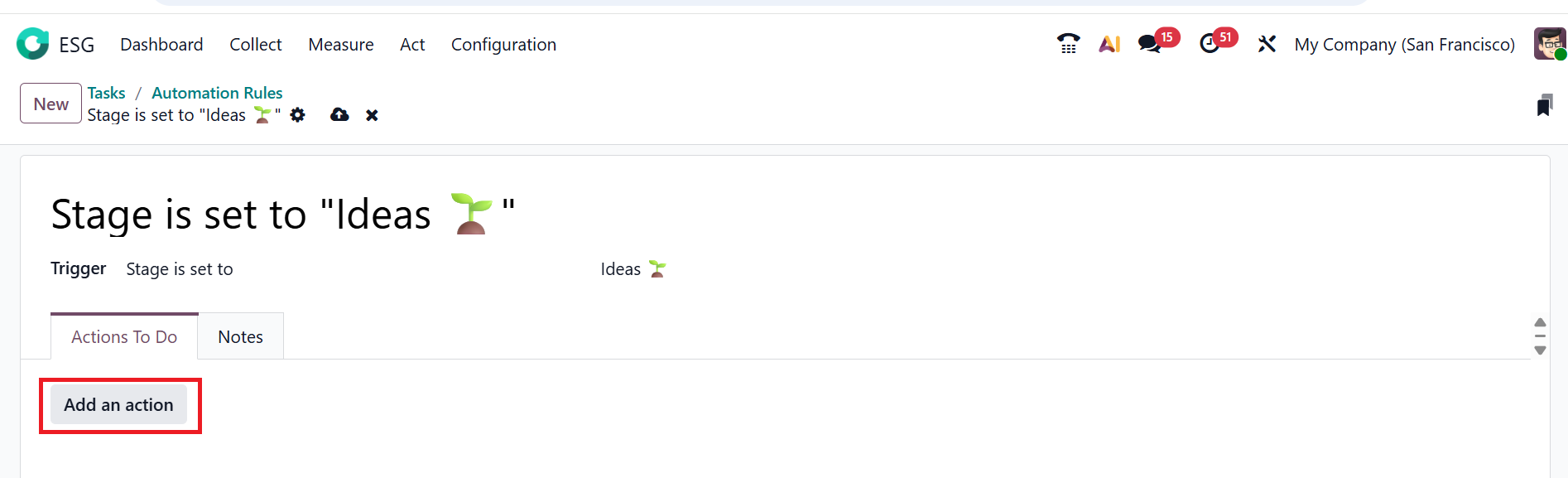 Set an explicit name for the automation rule. Here, the automation rule will activate in the Ideas stage. In the Trigger field, select a condition that activates the automation. Then, select a stage that will activate the automation rule. Under the Notes tab, add details about the automation rule for reference. In the Action To Do tab, click Add an Action.
