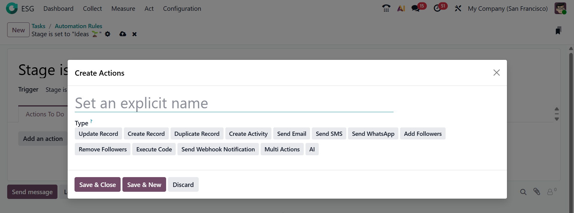 A pop-up window will open where you can name the action and select a server action from the Type field. Afterward, click Save & Close, Save & New, or Discard.