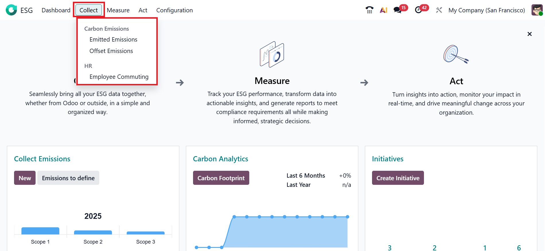 In the Odoo 19 ESG module, the Collect menu is designed to gather environmental and sustainability data from different company operations for analysis and reporting. It is regarded as the initial step in the ESG process. Under the Collect menu, you can see two sections: Carbon Emissions and HR. The Carbon Emissions section shows the options such as Emitted Emissions and Offset Emissions. The HR section shows the options, such as Employee Commuting.