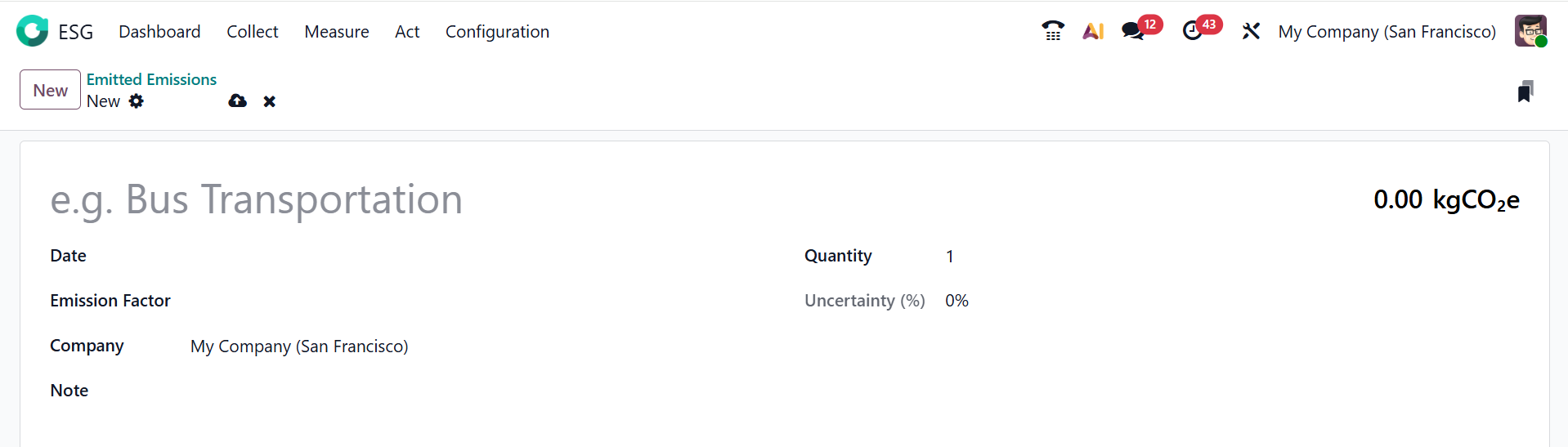 In the Odoo 19 ESG module, Emitted Emissions refer to the total amount of greenhouse gases released into the atmosphere by the company’s activities, such as fuel burning, electricity use, or transportation. It helps measure the organization’s carbon footprint and understand the amount of pollution produced. By default, Emitted Emissions are displayed in List View, but you can also switch to Kanban, Graph, or Pivot views. To create a new Emitted Emission, click on the New button.