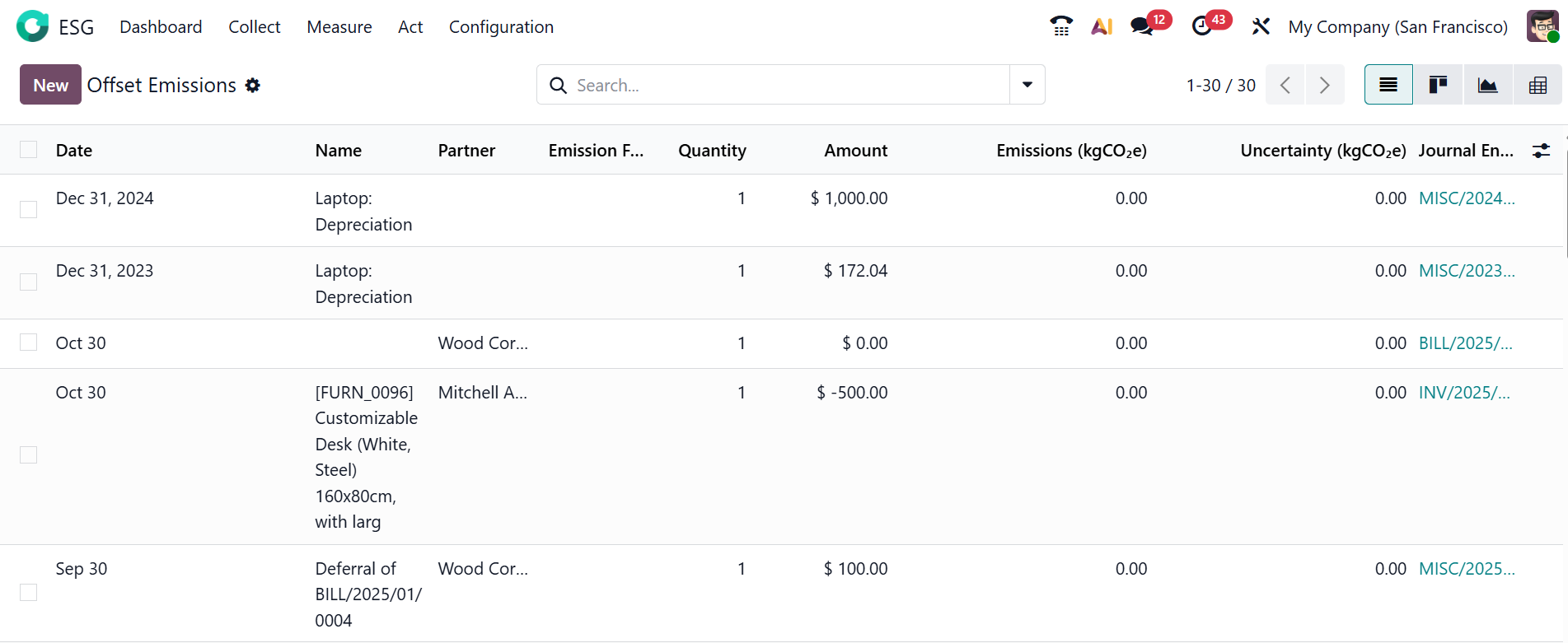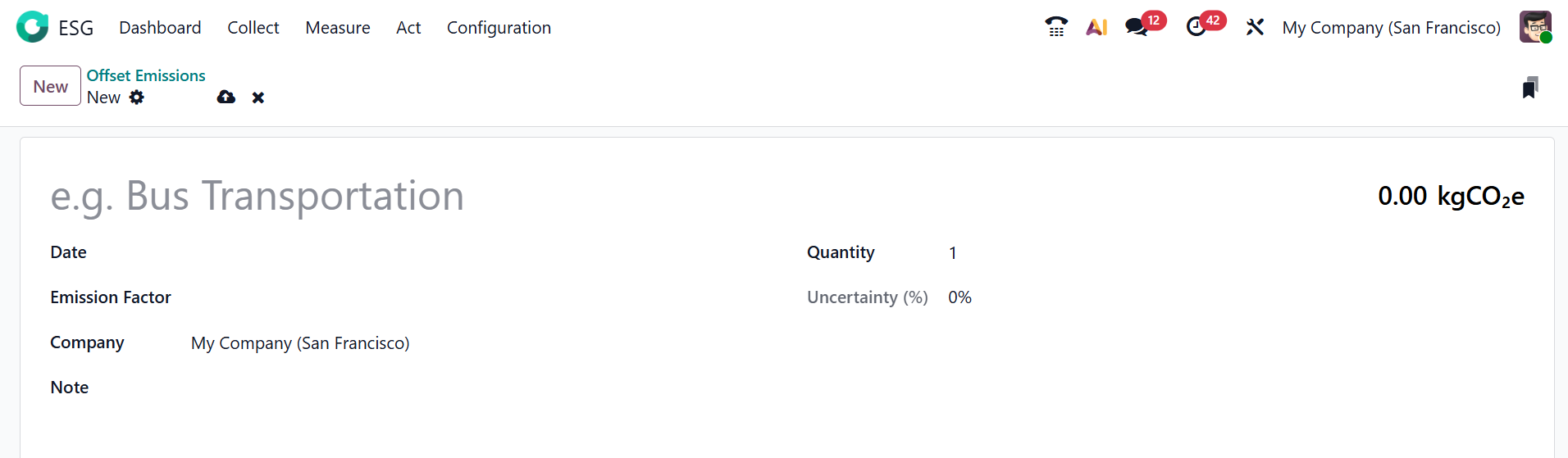In the Odoo 19 ESG module, Offset Emissions refers to the amount of greenhouse gases that a company compensates for by supporting activities such as tree planting or renewable energy. It helps reduce the organization’s net carbon footprint by balancing all of its emissions. You can view the Offset Emissions as a List, Kanban, Graph, and Pivot. To add a new Offset Emissions record, select the New button.