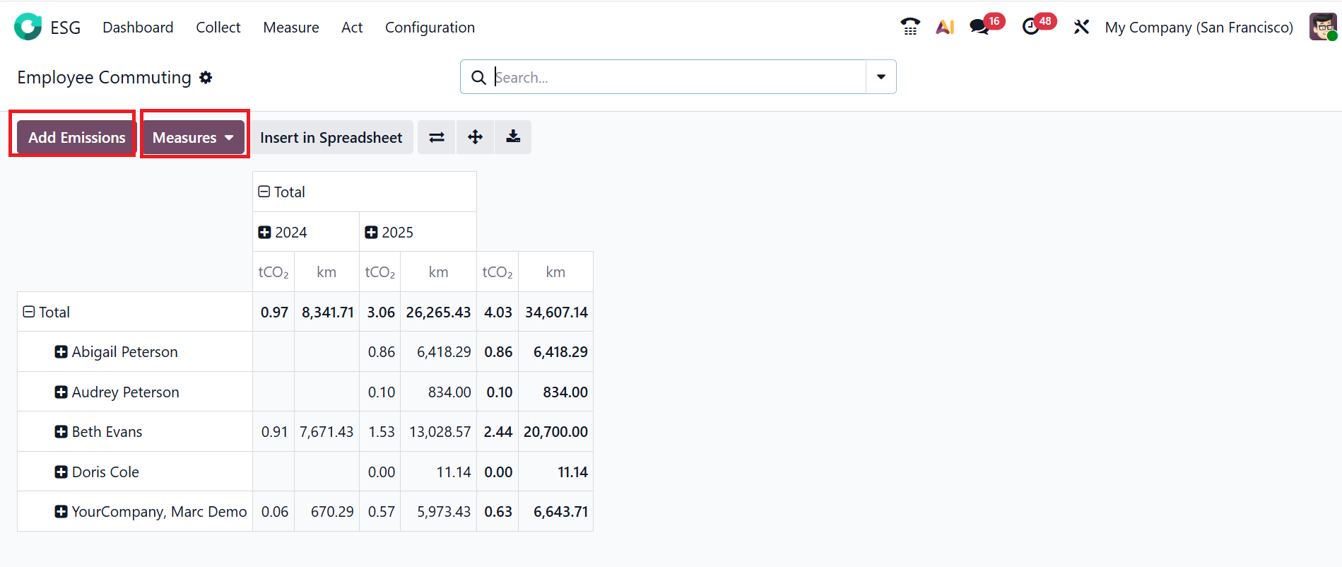In Pivot View, you can see the employees’ names along with their corresponding emissions. Click on the Measures button to add the values, such as gCO2/km, km, tCO2, and Count. Click the Add Emissions button to add the data to the list of emitted emissions.