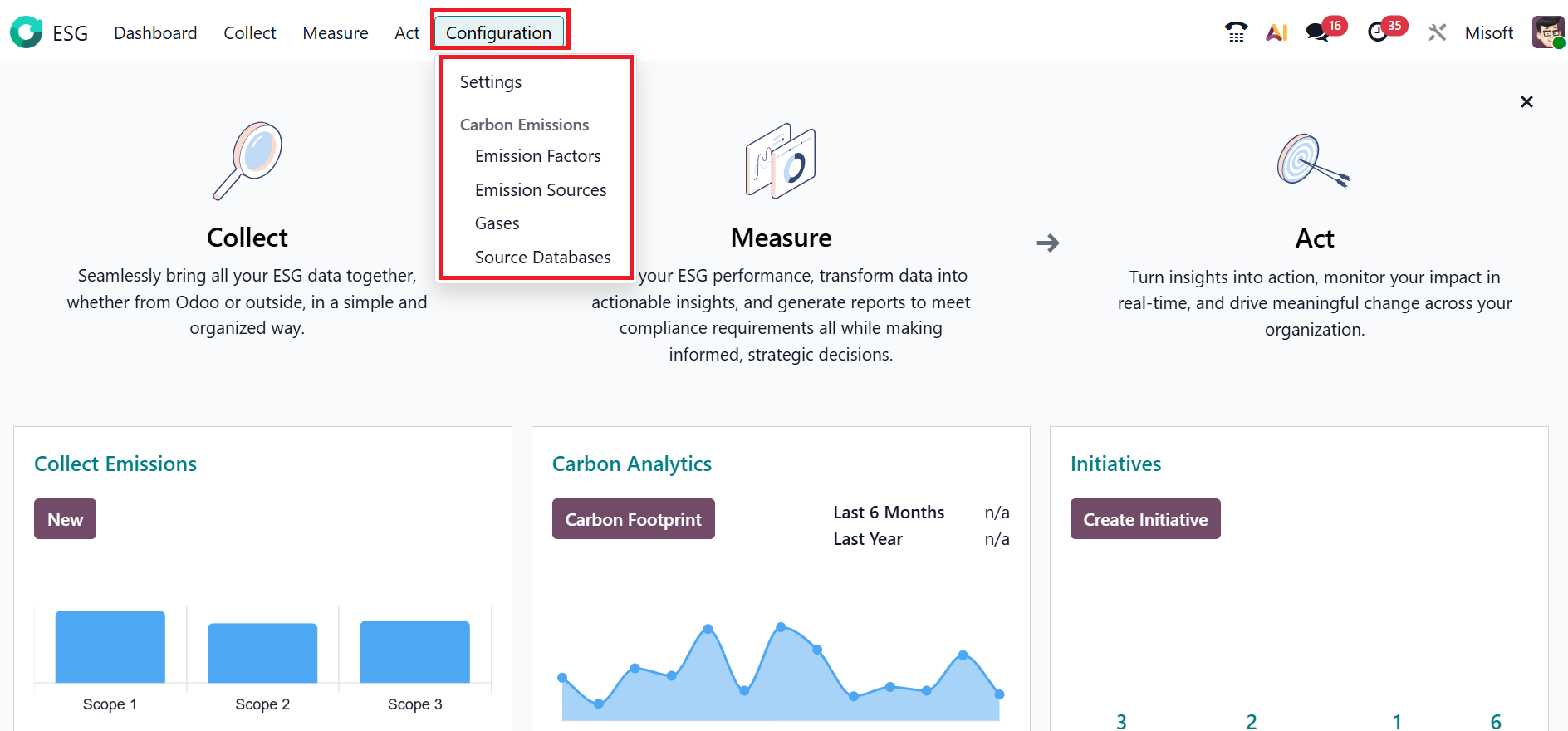 Under the Configuration menu in the Odoo 19 ESG module, you can view the sections such as Settings and Carbon Emissions. Under the Carbon Emissions section, you can view the options such as Emission Factors, Emissions Sources, Gases, and Source Databases.